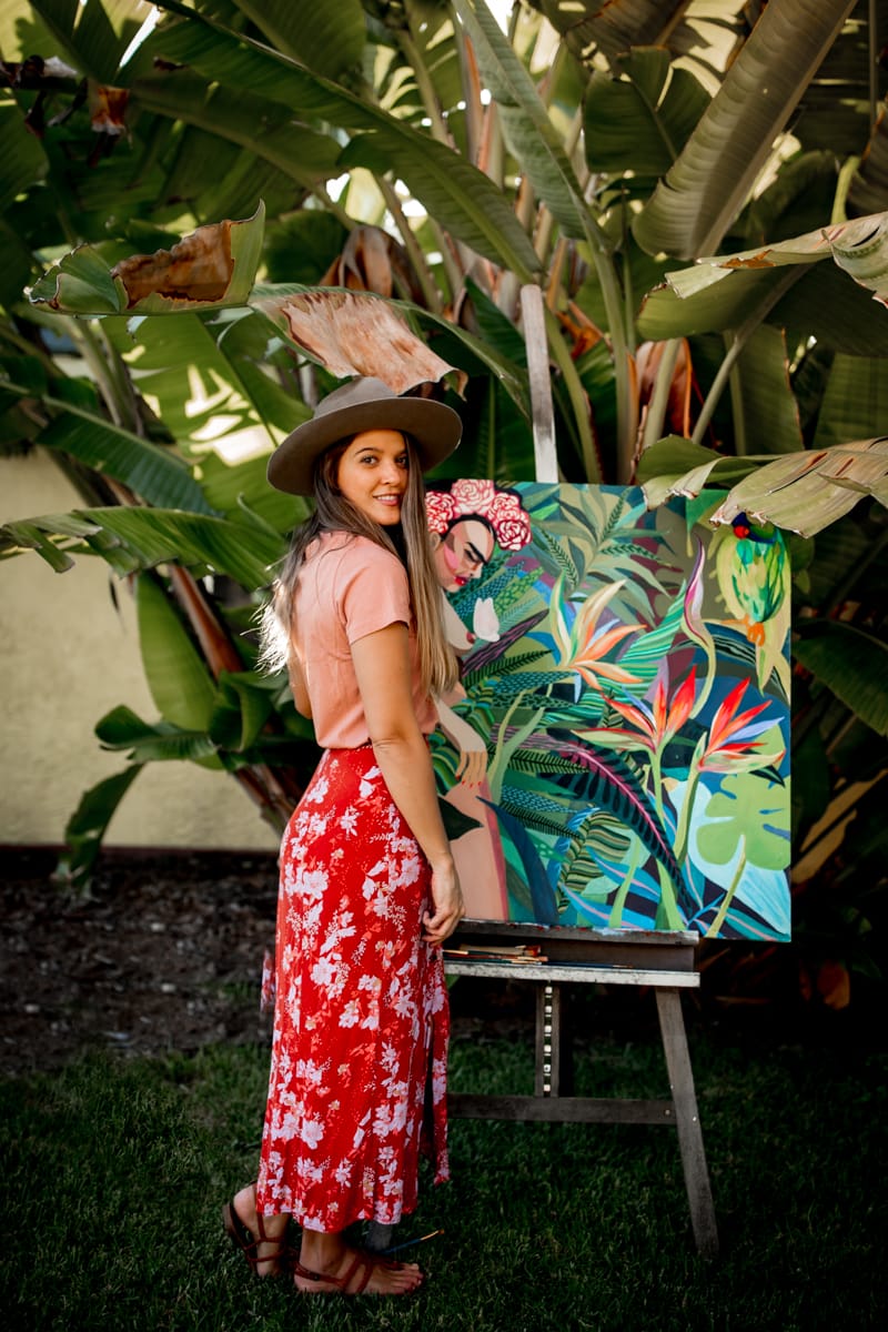 On top of co-owning a successful clothing company, Arrieta also creates paintings for art shows, commissions and more. She draws inspiration from growing up in Peru along with her travels since then. Arrieta enjoys painting female forms the most and uses this passion to bring representation to strong, confident women through art. “I don’t really tend to plan my paintings—it’s very organic,” explains Arrieta. Rather than having a regular painting schedule, Arrieta paints when she wants to and when she has the time. She describes her schedule as highly flexible. “Some days, I’ll do an entire day of painting, eight to 10 hours—it’s meditative,” she explains.