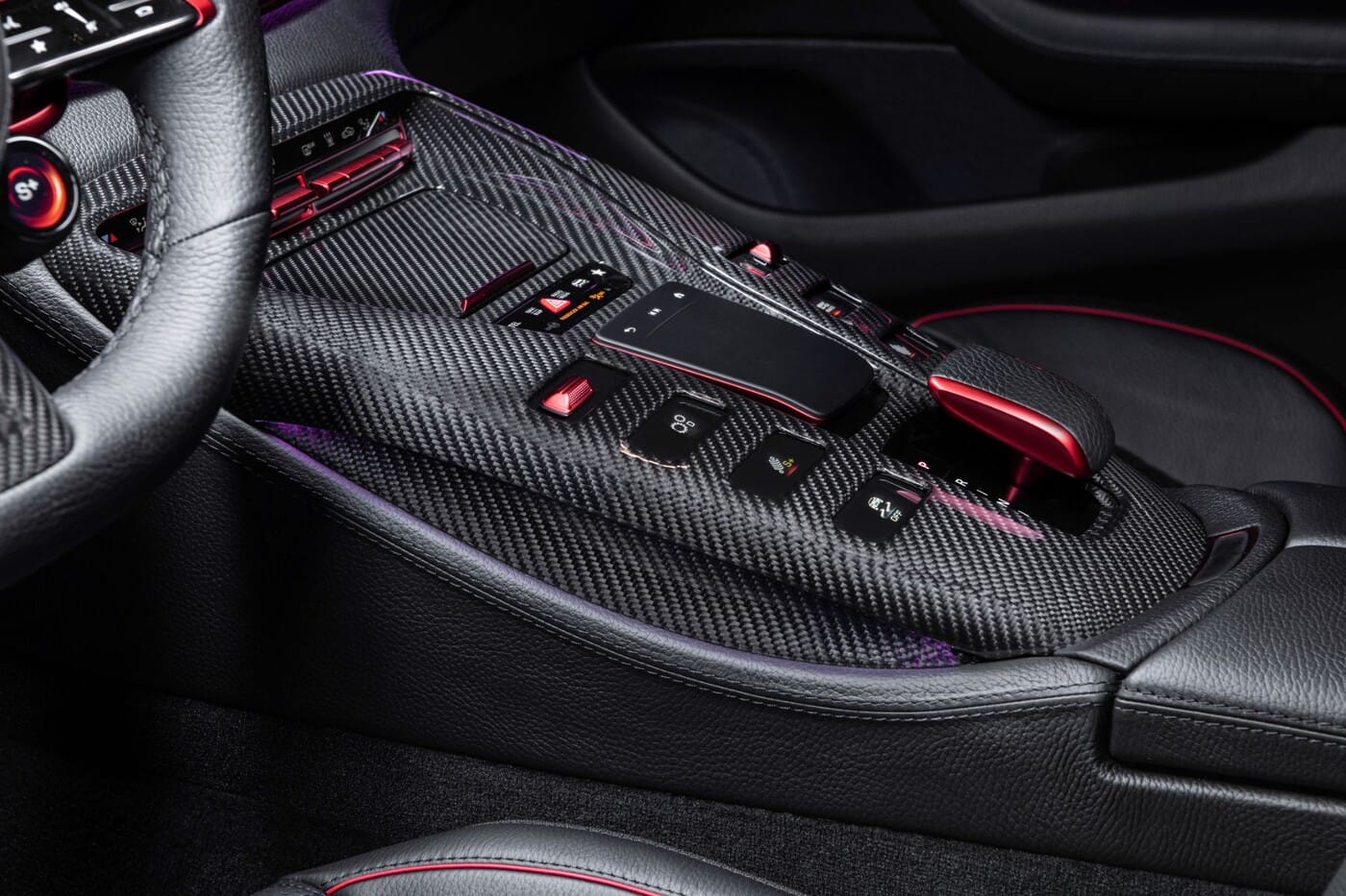 After countless hours in the wind tunnel, the chassis emerged with several exposed carbon fiber aerodynamic components. A subtle yet effective rear spoiler enhances stability. Custom caps for the large air intakes improve airflow. A redesigned grille optimizes temperature control and aero-efficiency. Each of these elements works together to create maximum downforce, keeping the car firmly planted on the road.