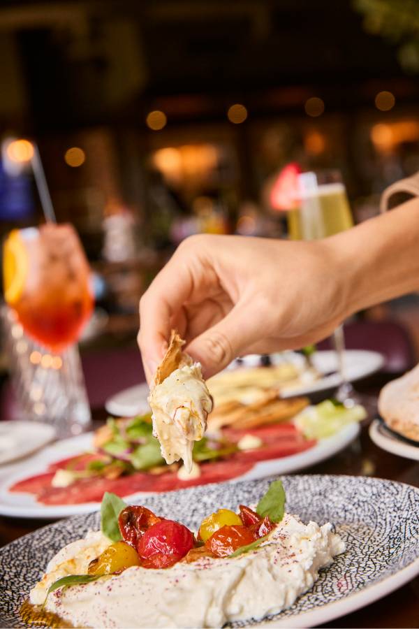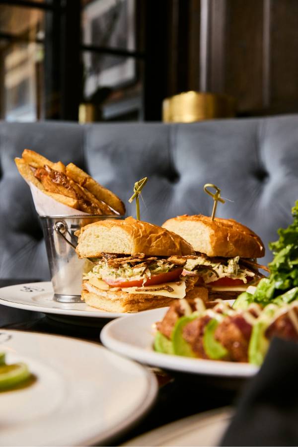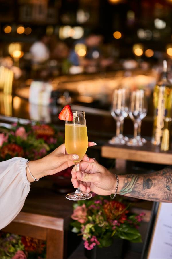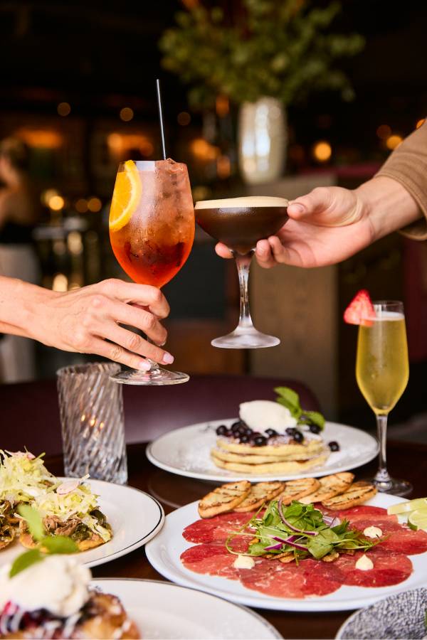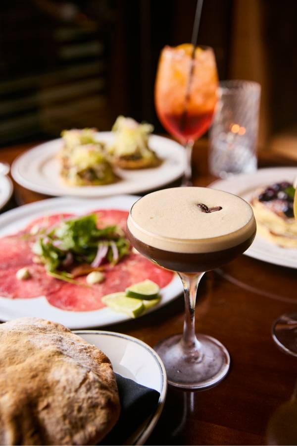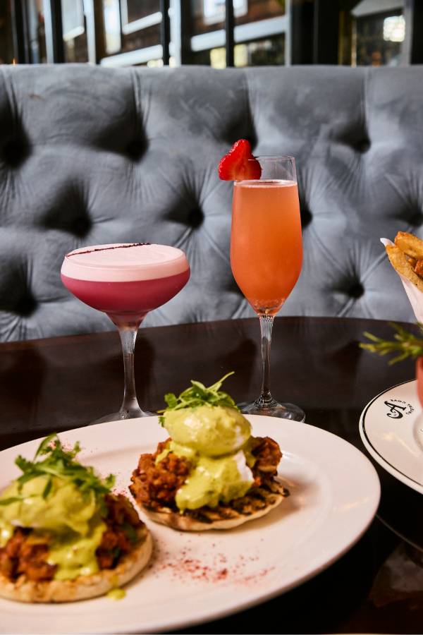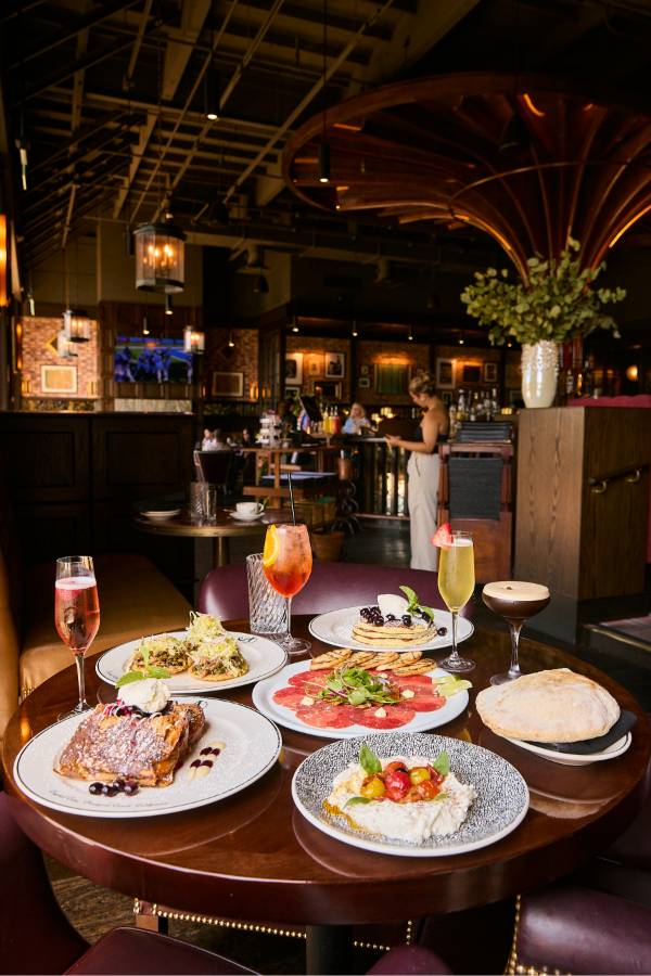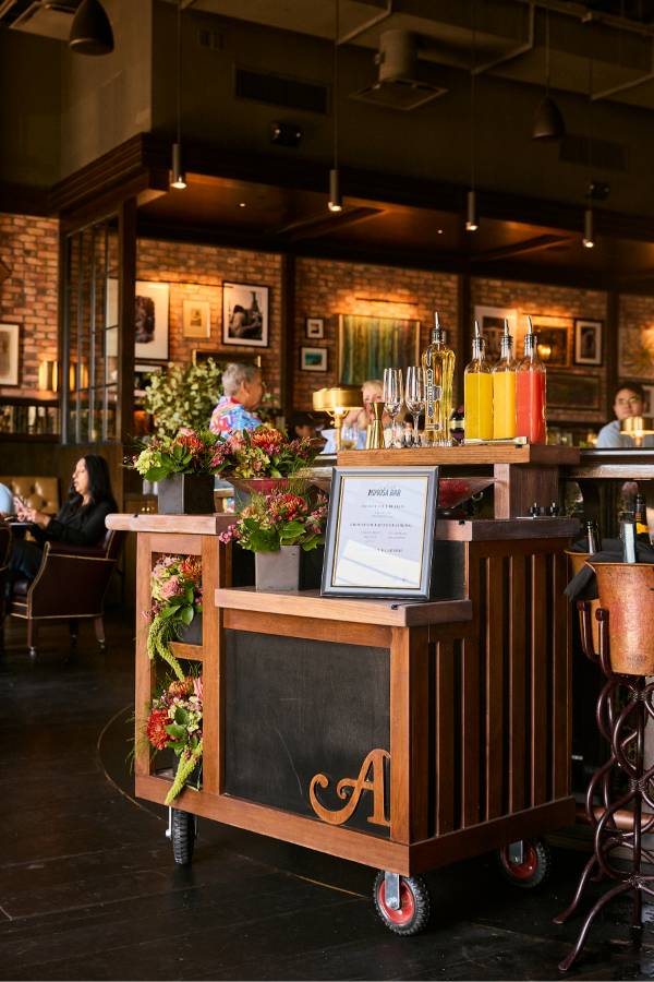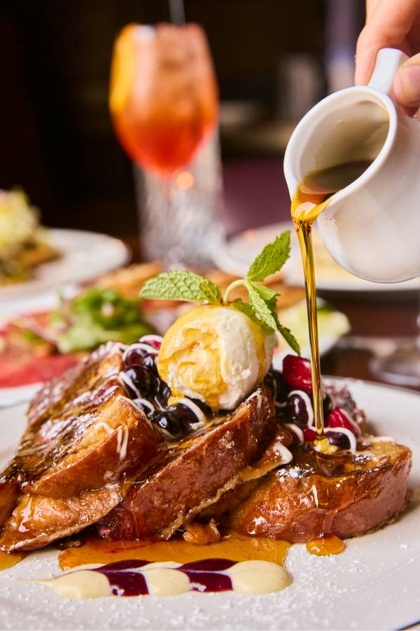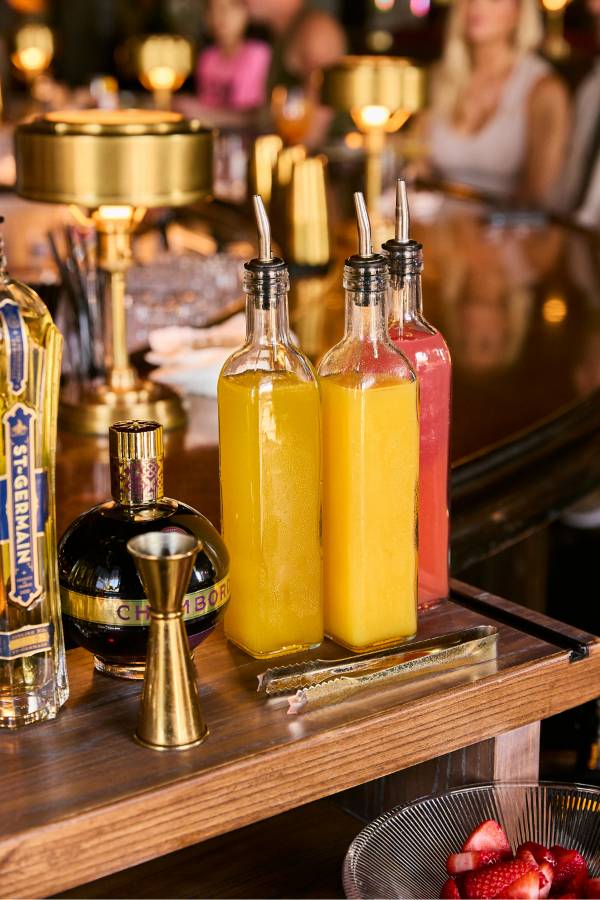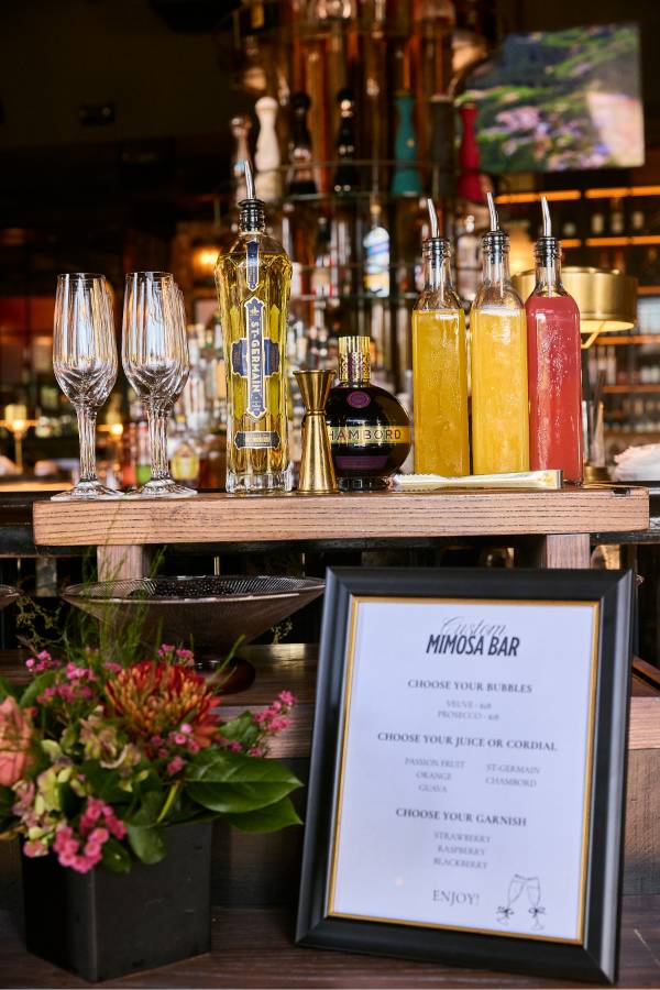 Every Saturday and Sunday, the Mimosa Cart is front and center and it’s impossible not to smile when you see it. The cart is overflowing with fresh flowers and glass bowls are filled with a delicious selection of seasonal garnishes to choose from. Your glass starts with Veuve Clicquot or Prosecco, then gets a splash of passion fruit, guava or orange juice, a hint of Chambord or St-Germain and a finish of fresh berries and citrus. The experience feels interactive and celebratory, whether you’re creating your perfect glass with friends or surprising your table with a bottle of bubbles to share. The cart is one part cocktail service, one part Instagram moment and it sets the tone for a brunch that feels elevated from the start.