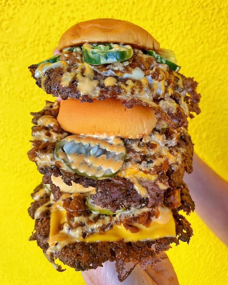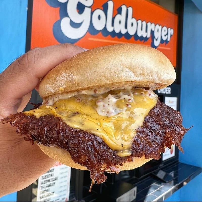 With two locations in East LA, Goldburger has mastered the art of 100% grass-fed smashburgers. The thin patties boast beautifully crisp edges, and though their signature Goldburger already features two patties, you can always add an extra for $4. That said, the ingredient that truly sets this burger apart from the competition is the award-winning garlic mustard aioli. For an extra meaty meal, add pastrami to your burger and indulge in a side of curly fries with spicy ranch. Pro tip: If you like spice, ask for chopped chiles.