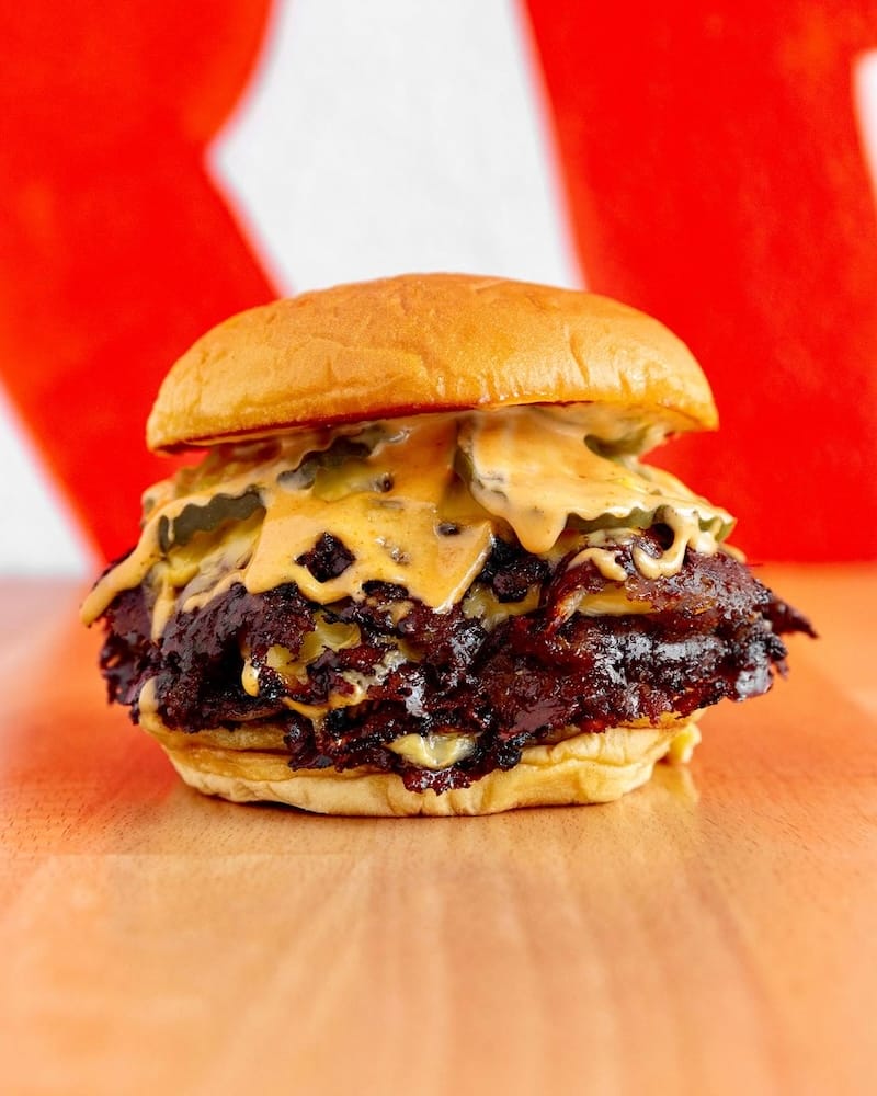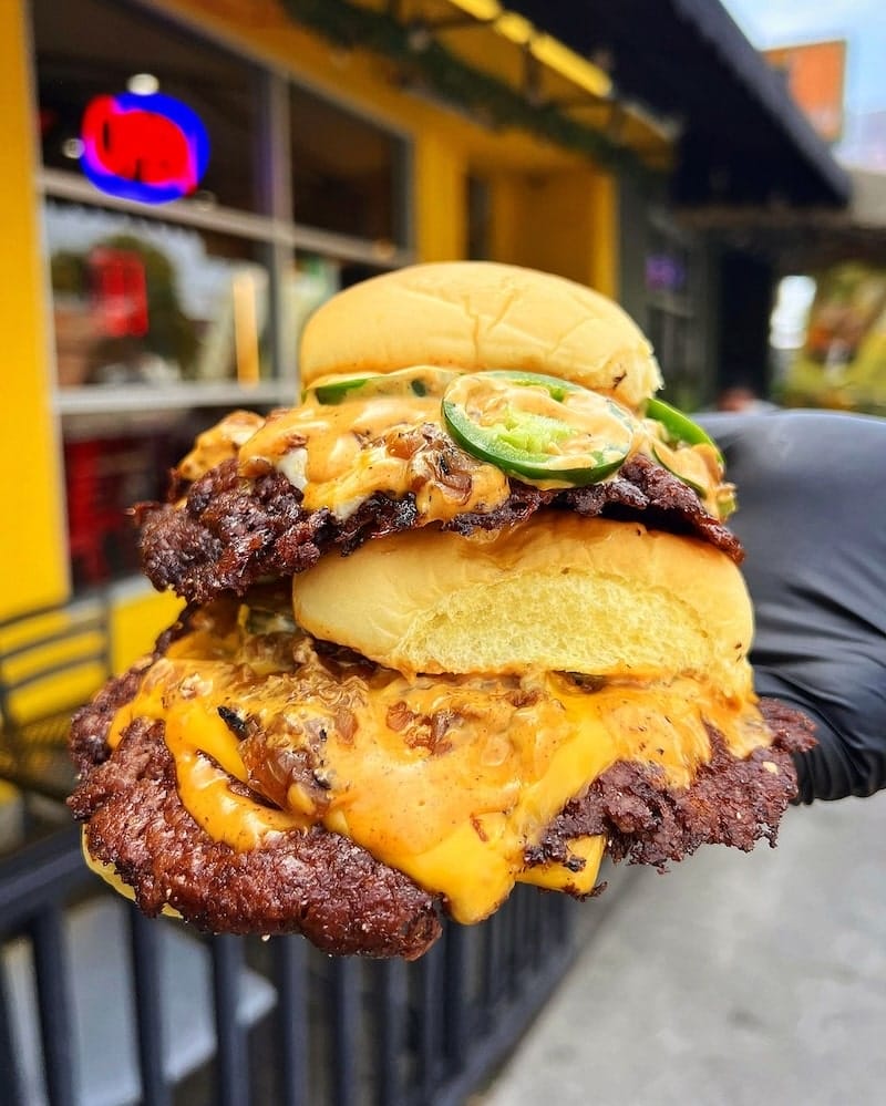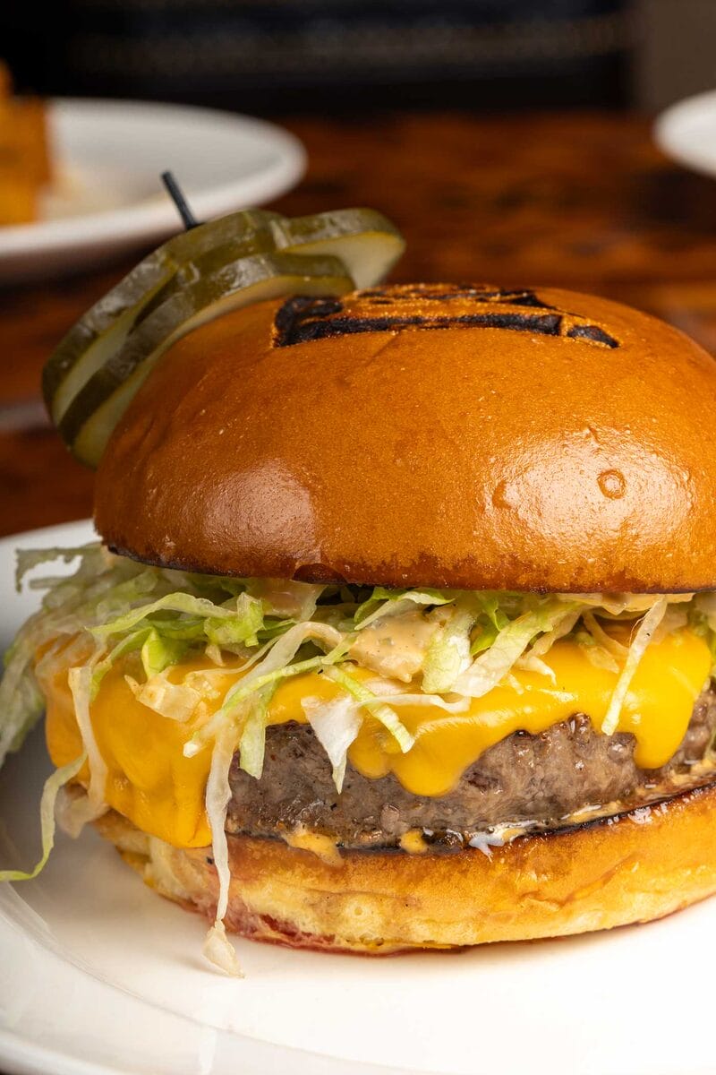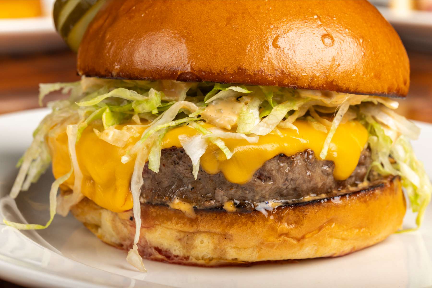 Looking for an upscale burger with an ambiance to match? Lawry’s Beverly Hills is a historic restaurant that has been around since 1938. The old-school dining room features cozy booths, antique paintings and mahogany accents that adhere to a traditional steakhouse vibe. Though prime rib is the star of the show here, the restaurant recently added a mouthwatering burger to its menu that you won’t want to miss. Lawry’s Burger is made with a half-pound patty, housemade vintage sauce, sharp New School American cheese, crisp shredded lettuce and a pillowy brioche bun. The top bun is engraved with Lawry’s signature logo and a double pickle garnish, making it just as Insta-worthy as it is tasty. This burger is now available on the late-night menu and the new bar bites menu, where you’ll also find delicious dishes like the prime rib katsu sando, cheesy onion fondue and a decadent prime rib sandwich. Enjoy your burger alongside a glass of cabernet sauvignon or your favorite whiskey for an unforgettable meal in one of the city’s oldest restaurants.