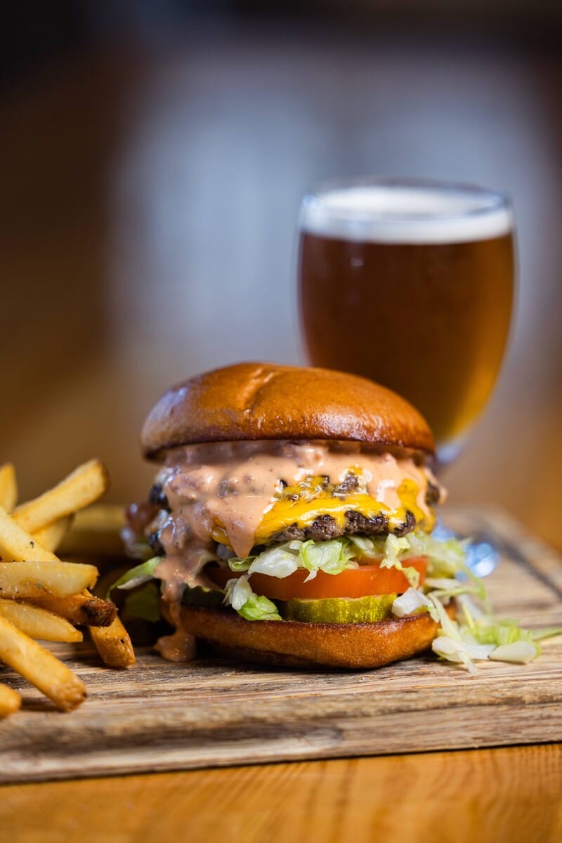 The Cellar is a homey, neighborhood cheese shop and wine bar known for its swanky, intimate atmosphere and stellar fare. They do it all here—coffee and brunch, happy hour and even a bubbly bar. Their signature Cellar burger is comprised of a Wagyu and chuck-blend patty, white American cheese, honey gem lettuce, tomato, red onion and house pickles. And since The Cellar is also a wine bar, order a glass of red while you’re there to perfectly complement your burger.
