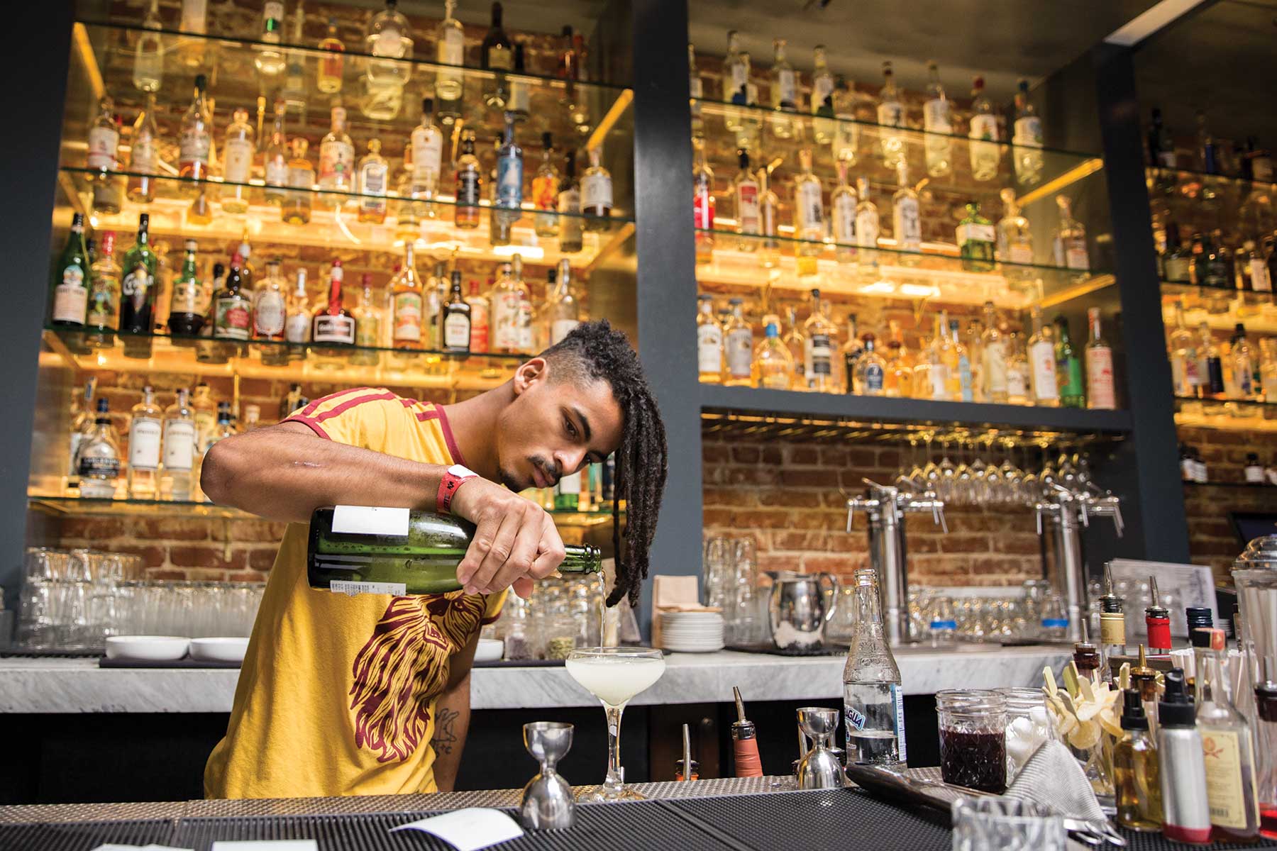 Everson Royce Bar, more commonly known as ERB, has been an Arts District mainstay since it opened eight years ago, thanks to great drinks, delicious food and an expansive patio. During happy hour, select cocktails are only $10, such as the frozen paloma or the Bee Sting—made with tequila, honey, lemon and a spicy tincture. There’s also a $6 house lager and $8 wines. Food deals start at $6, including their famous burger, priced at $14 with fries. Still hungry? Don’t miss the $12 chicken and biscuits, served with cinnamon-honey butter.