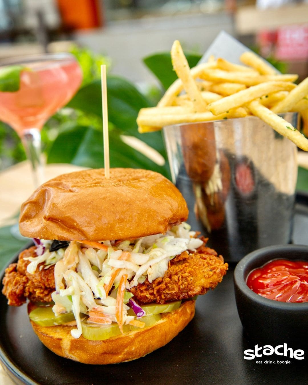Whether it’s people-watching with boardwalk seating at The Waterfront or lounging on the relaxed, leafy patio, there’s a space here to suit your needs. There’s also something for everyone to sip during happy hour. Their concept is simple, and sometimes simple is best, especially if it’s BOGO. Yep, from 3-7 p.m. on Tuesday through Friday (they’re closed on Mondays), drinks are buy one, get one free. Order that frosé, nitro espresso martini or whatever else your heart desires. Of course, wine and beer are also BOGO. On Thursdays and Fridays, the DJ starts spinning at 4:30 p.m.—around the time that first drink kicks in.