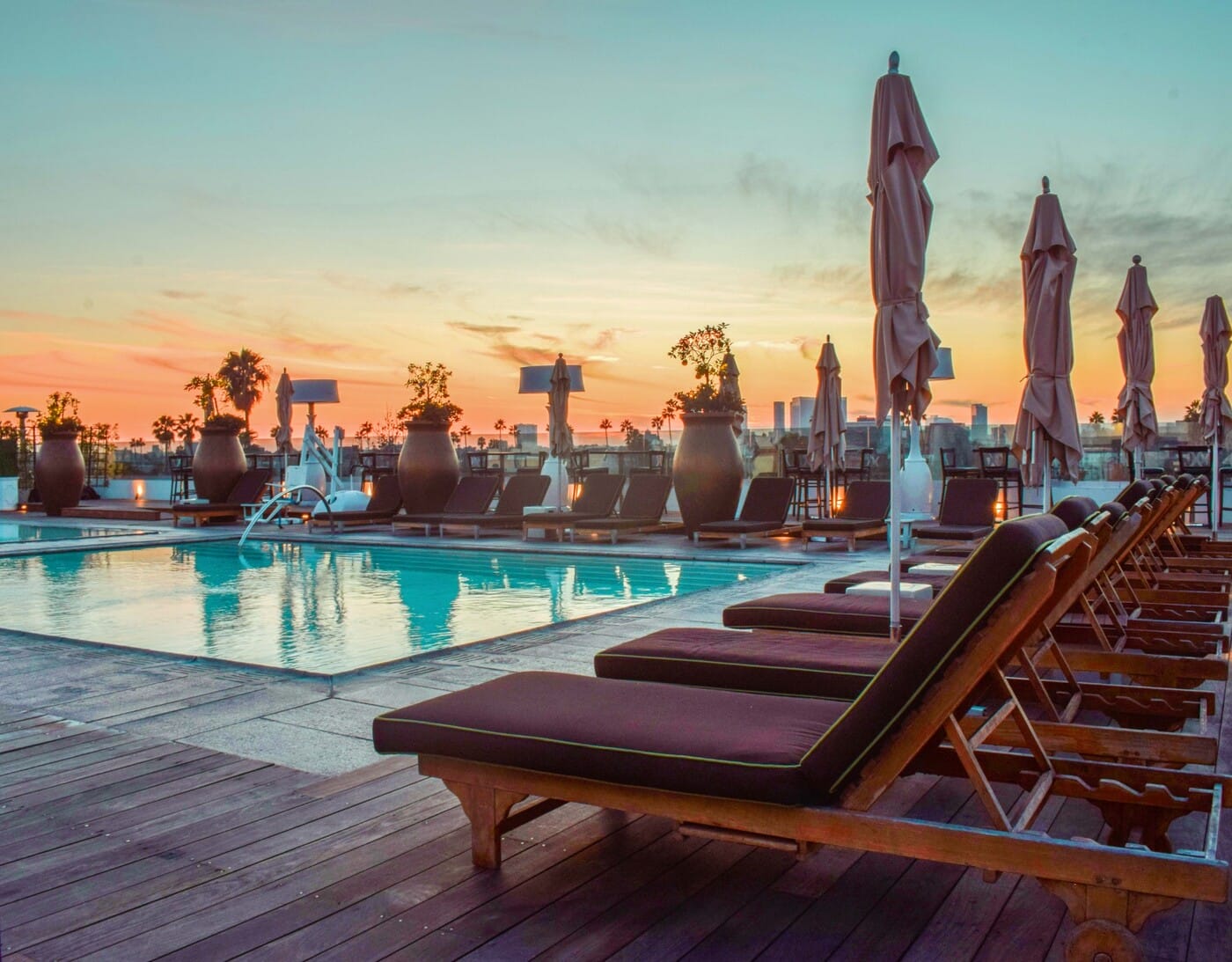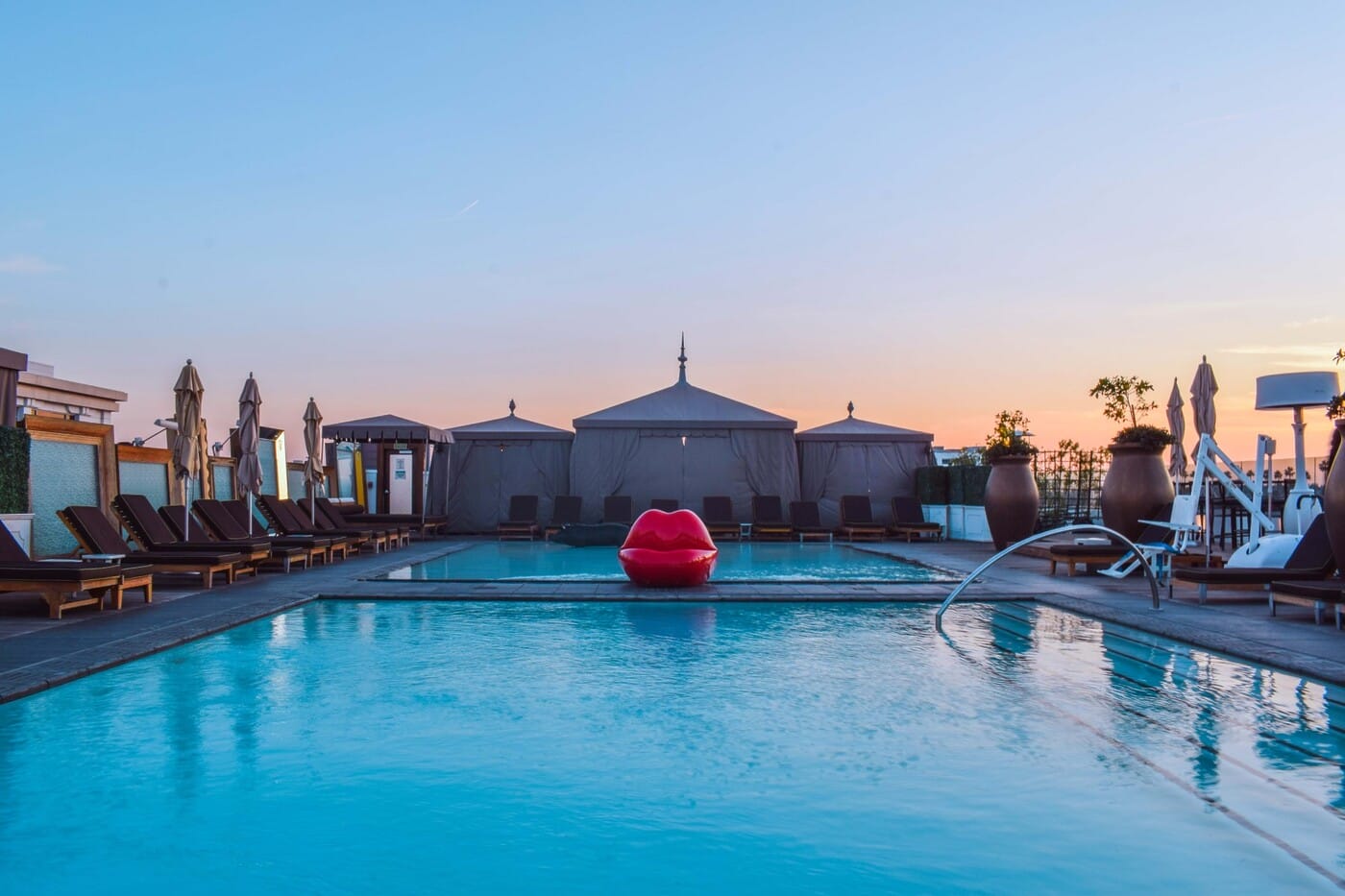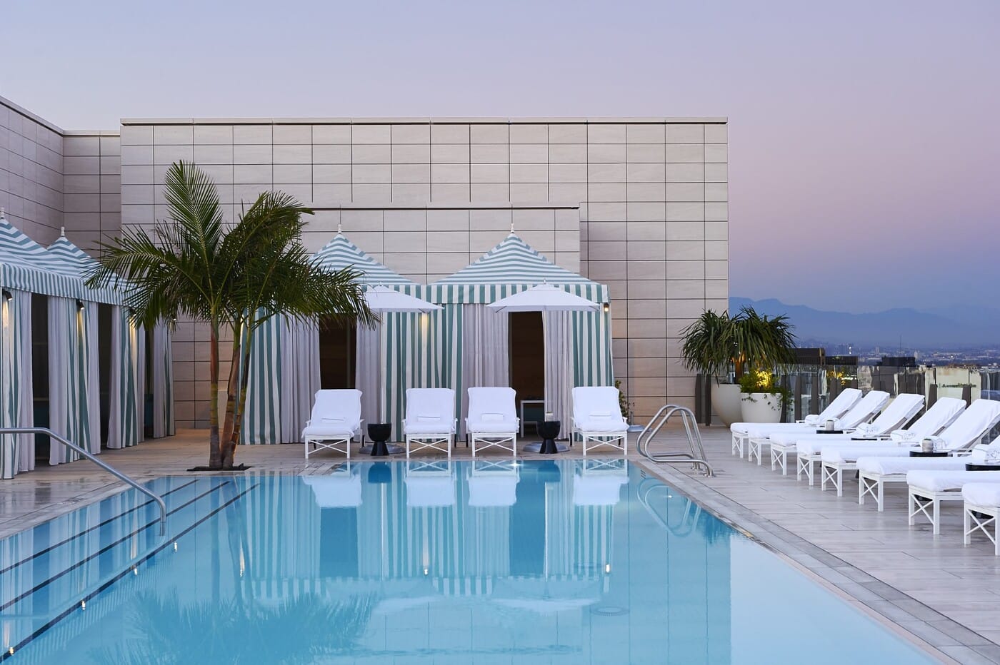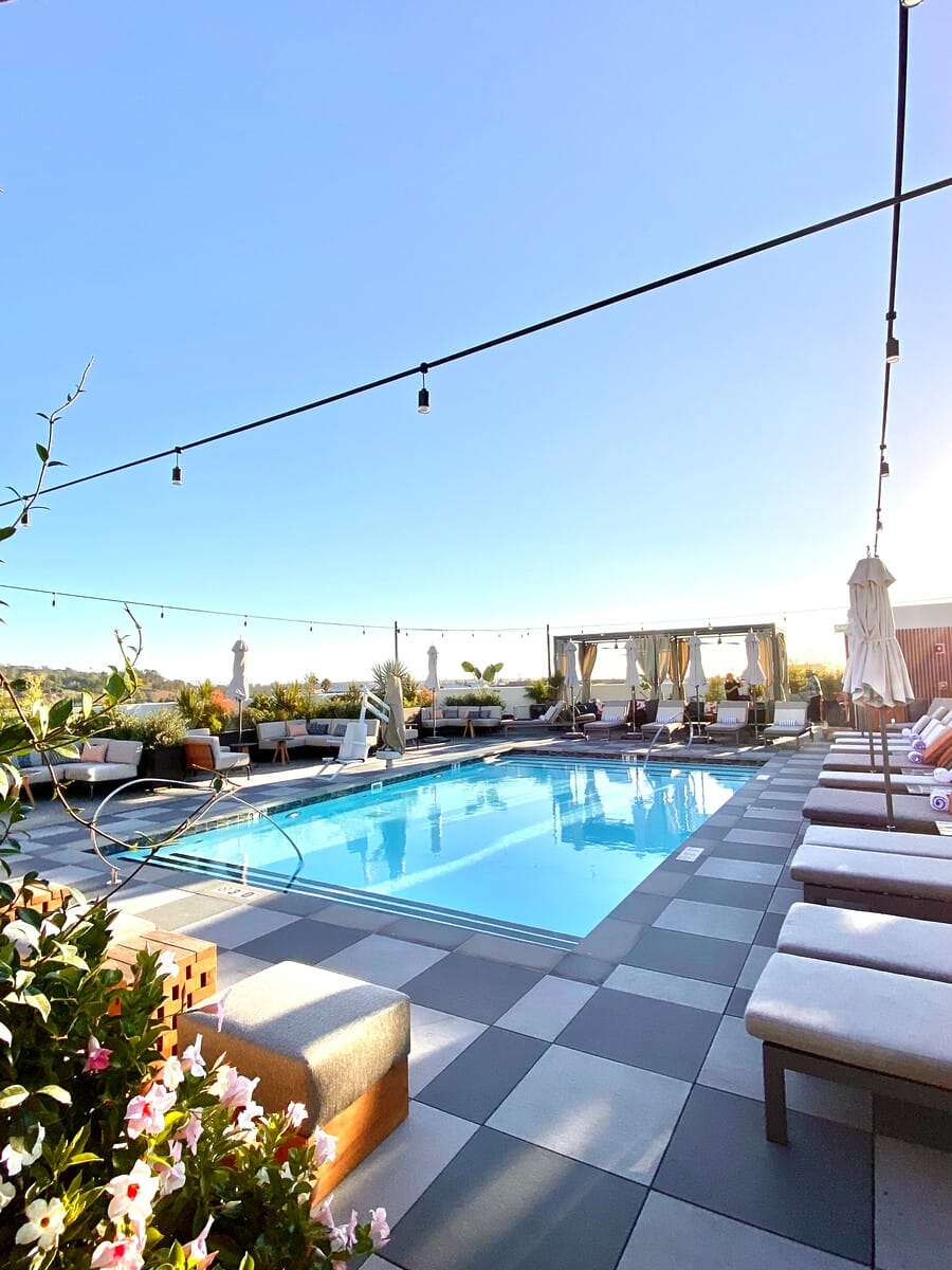 Santa Monica’s only real rooftop pool is a beach oasis with tropical plants surrounding the pool and an earthy color palette on the loungers and umbrellas. The pool menu offers breakfast until noon and all-day bites with a Mediterranean slant, such as hummus, Greek salad and kebabs. Pool access is exclusive to hotel guests although the rooftop restaurant, Calabra, is open to the public. There are no cabanas here; instead, there are alcoves shaded by palm trees. The alcoves seat up to 12 guests and can be reserved for half-days. You’re going to want to catch the sunset from up here!