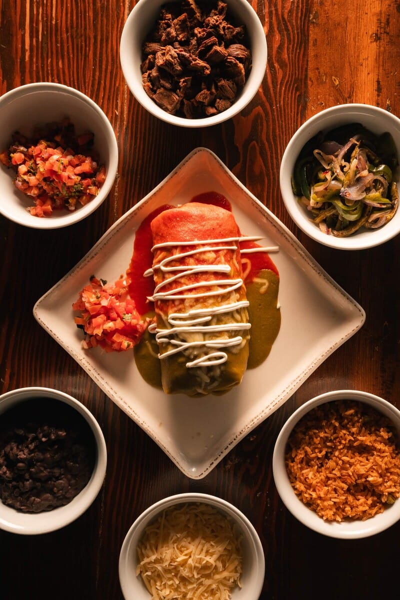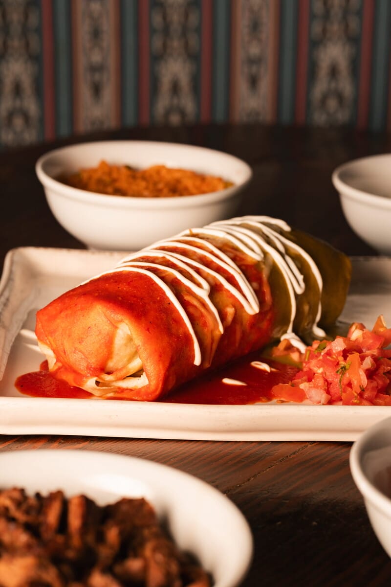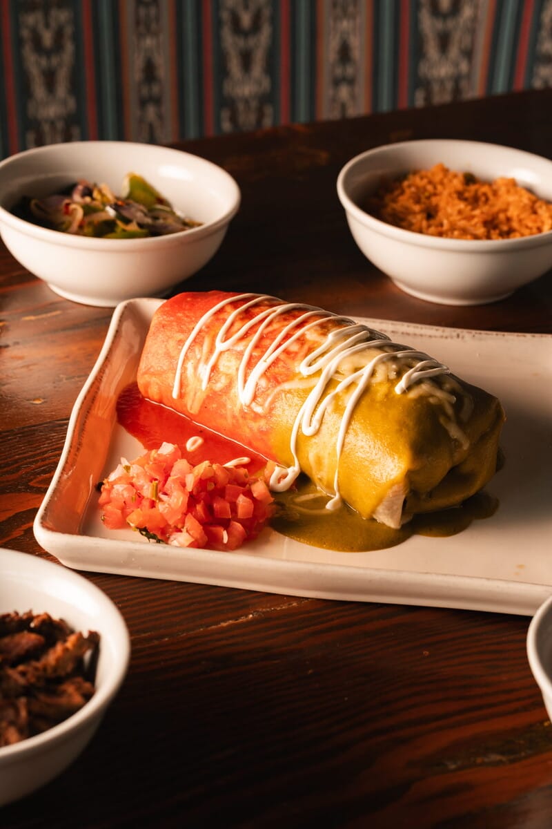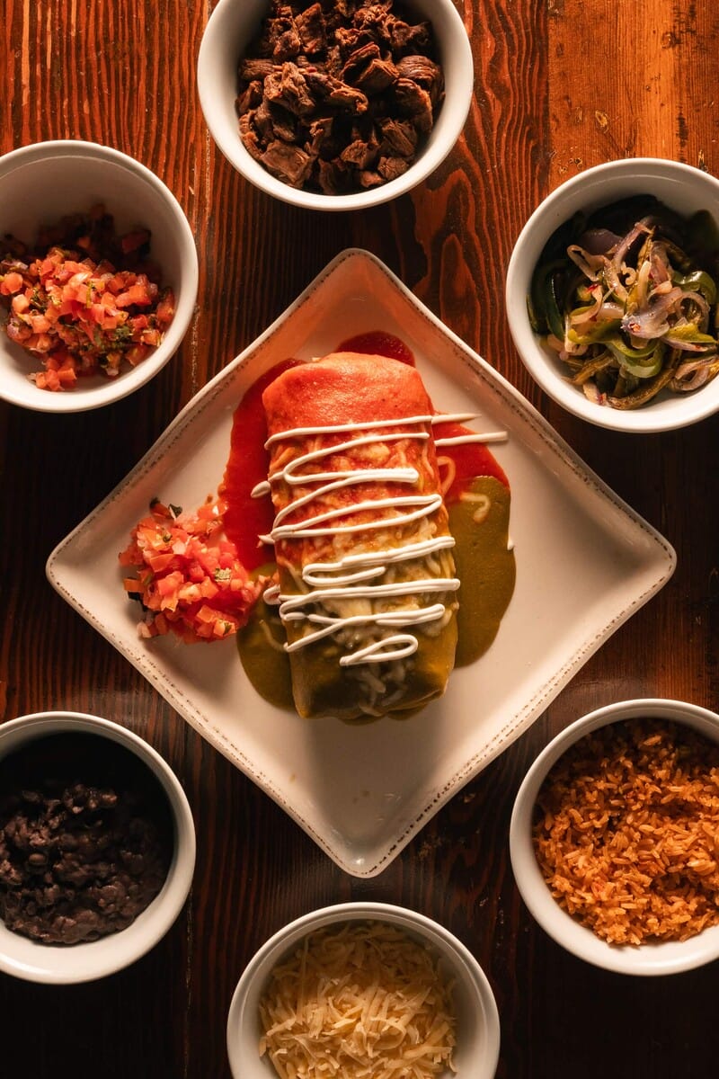 Guests can choose any protein they want for this burrito, be it chicken, lobster, veggies, carnitas, shrimp or carne asada. The asada is Chef Amado’s favorite because it reminds him of childhood in Mexico and the flavors of home. He recalls memories of the smell of meat cooking over a wood fire on his family farm. This masterpiece is wrapped in a warm tortilla and covered, enchilada-style, in both green and red salsa.
