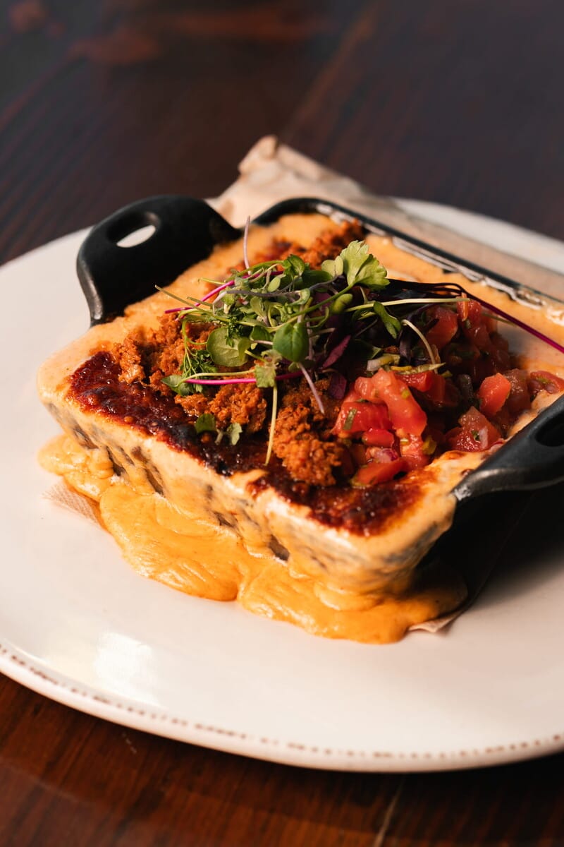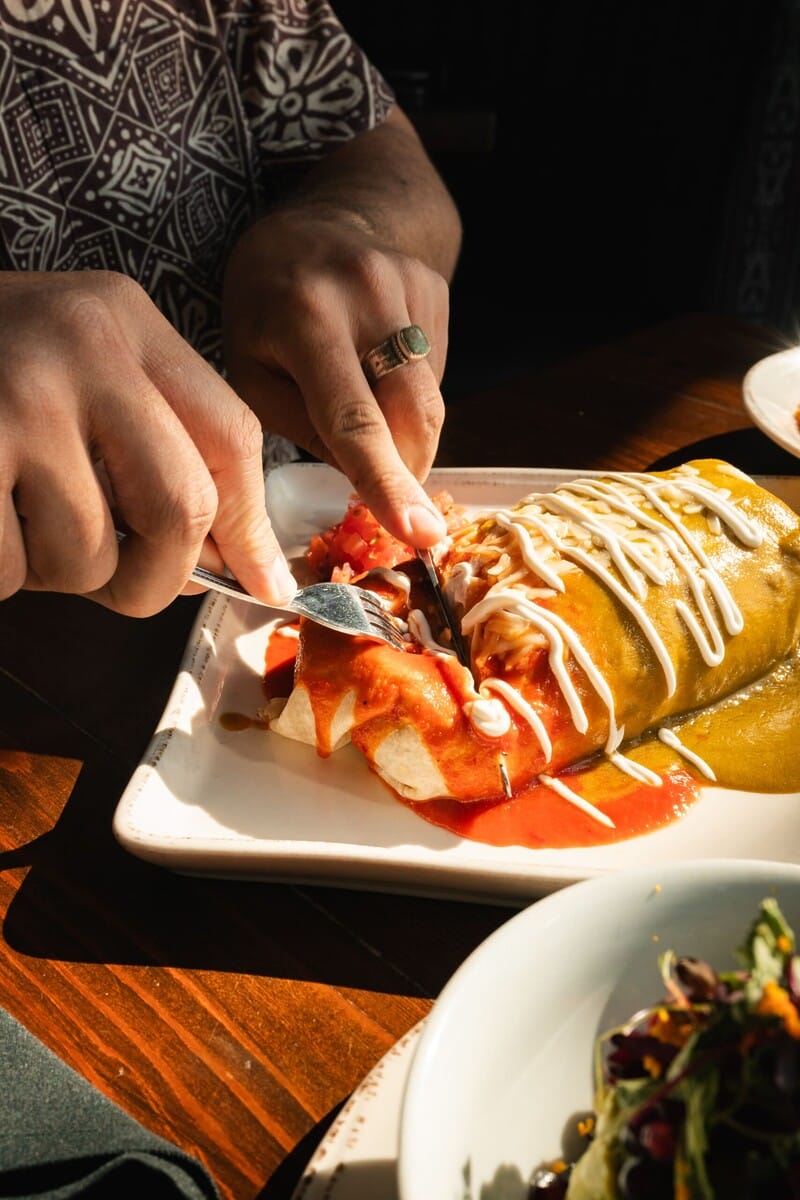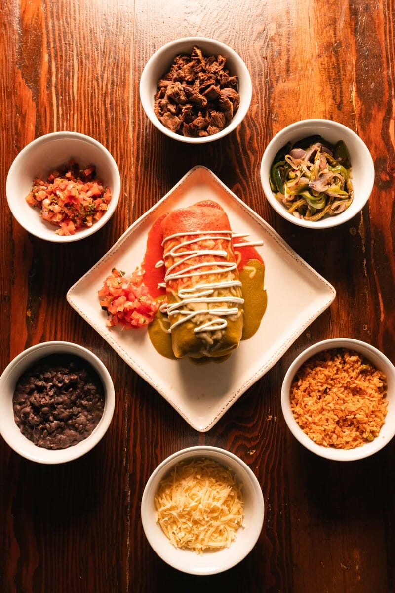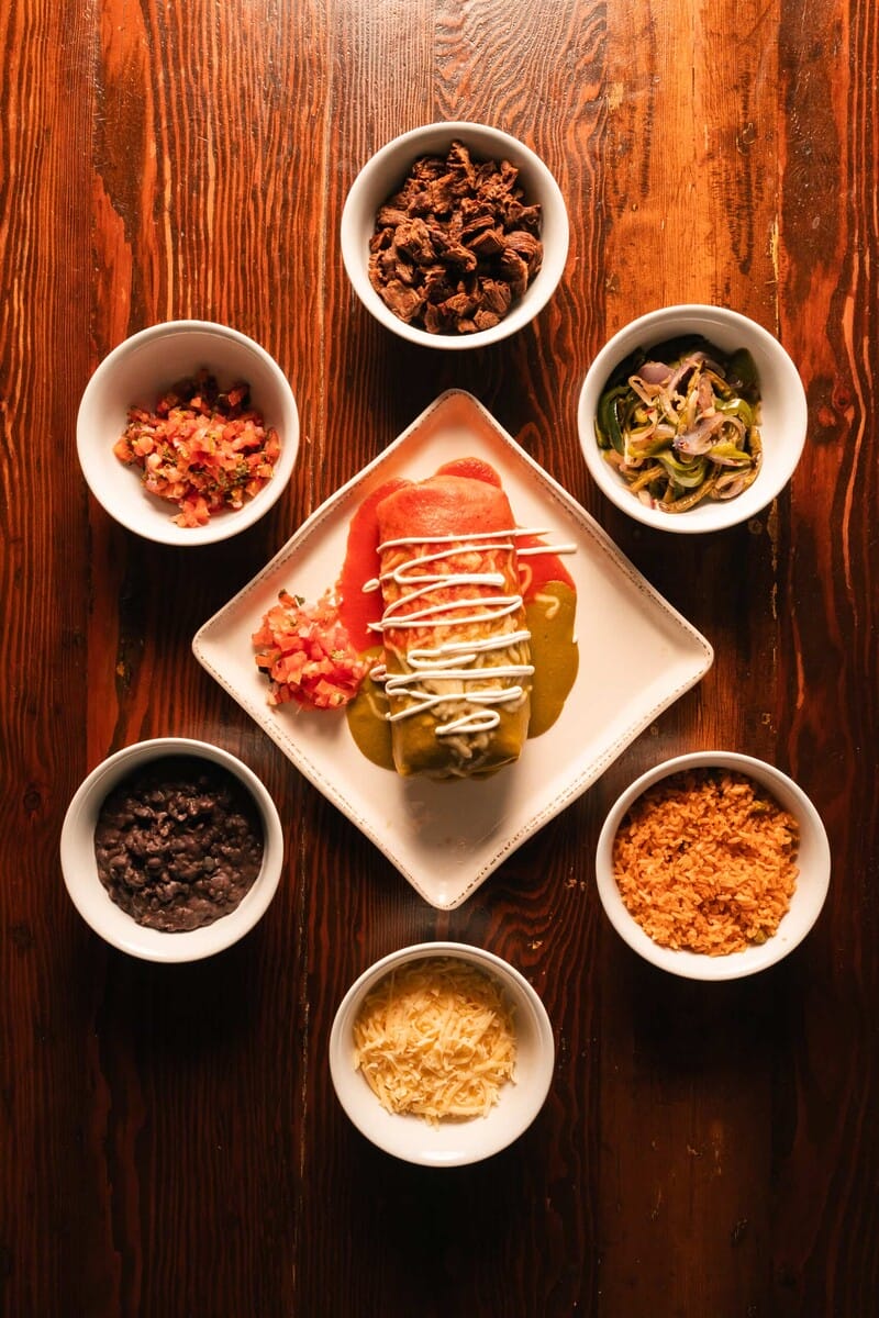 Guests can choose any protein they want for this burrito, be it chicken, lobster, veggies, carnitas, shrimp or carne asada. The asada is Chef Amado’s favorite because it reminds him of childhood in Mexico and the flavors of home. He recalls memories of the smell of meat cooking over a wood fire on his family farm. This masterpiece is wrapped in a warm tortilla and covered, enchilada-style, in both green and red salsa.