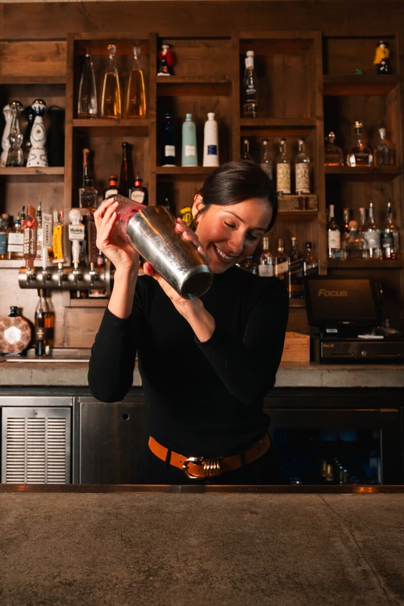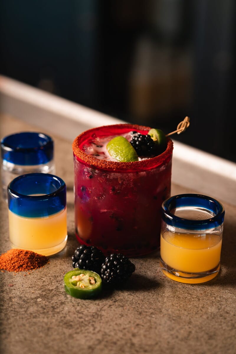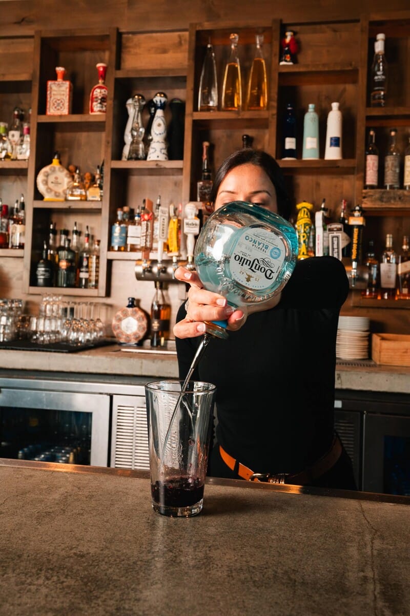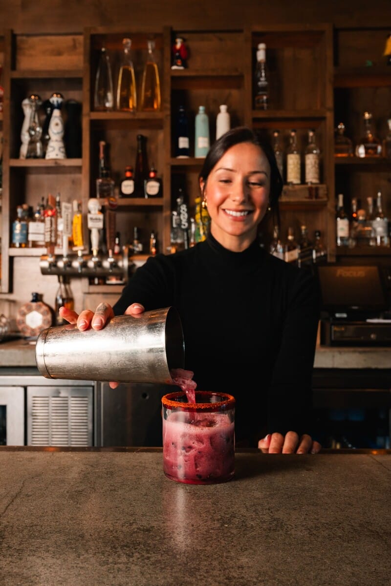 Next, they add some pineapple juice, shake it, and pour it into a glass with a Tajin rim. This drink is particularly great because when pineapple juice is shaken, it gets frothy on top. The silver tequila, berry and jalapeño combine to create a well-balanced flavor profile.