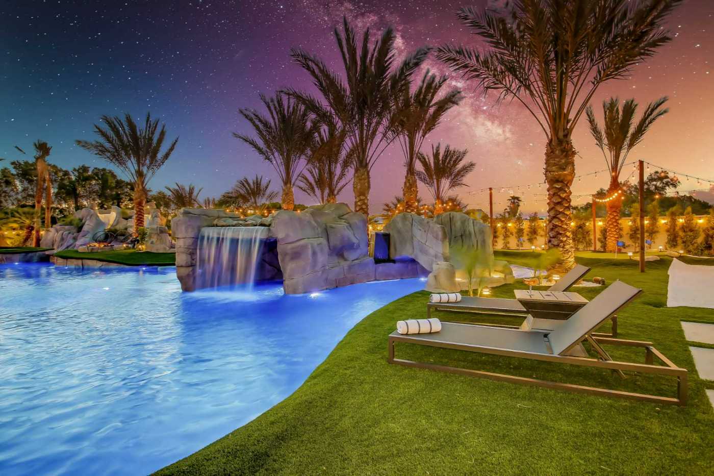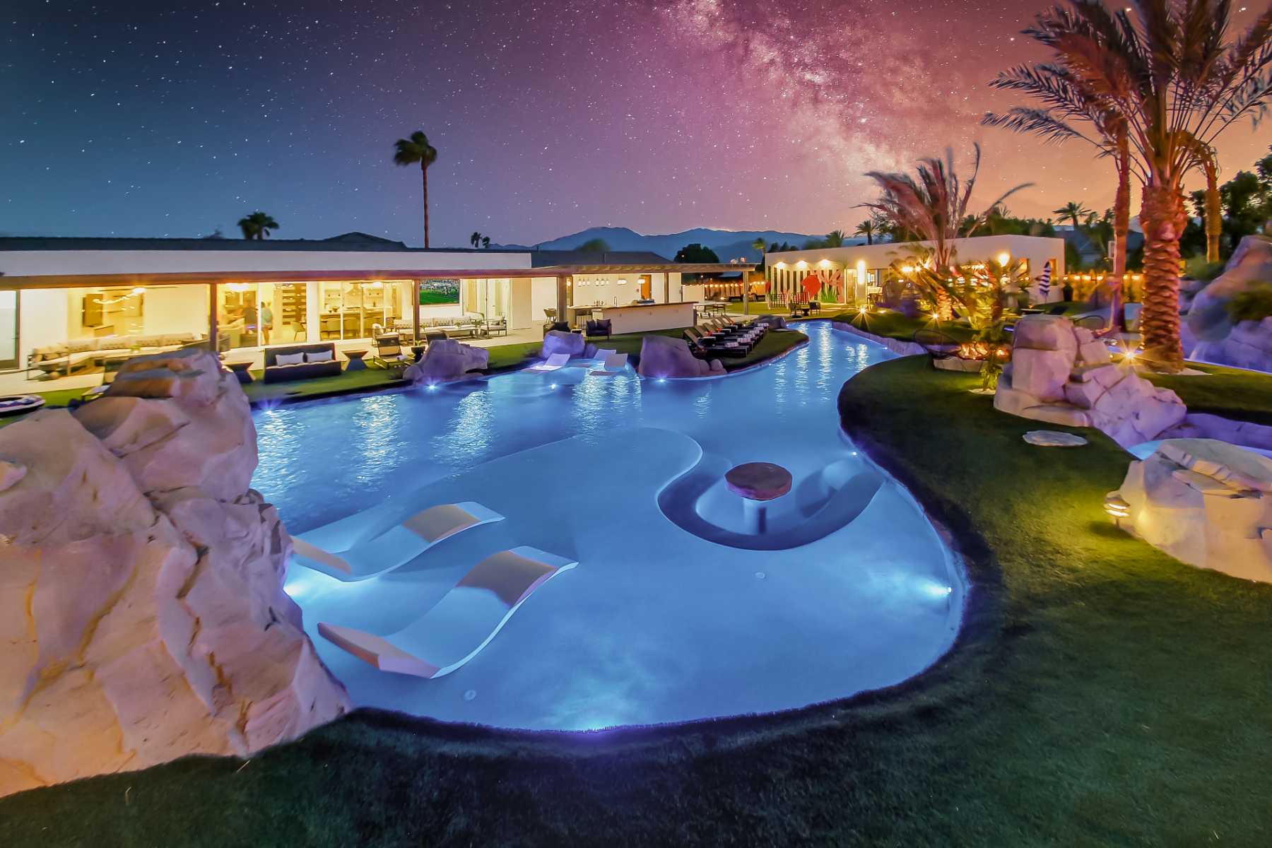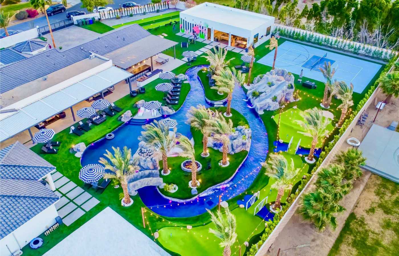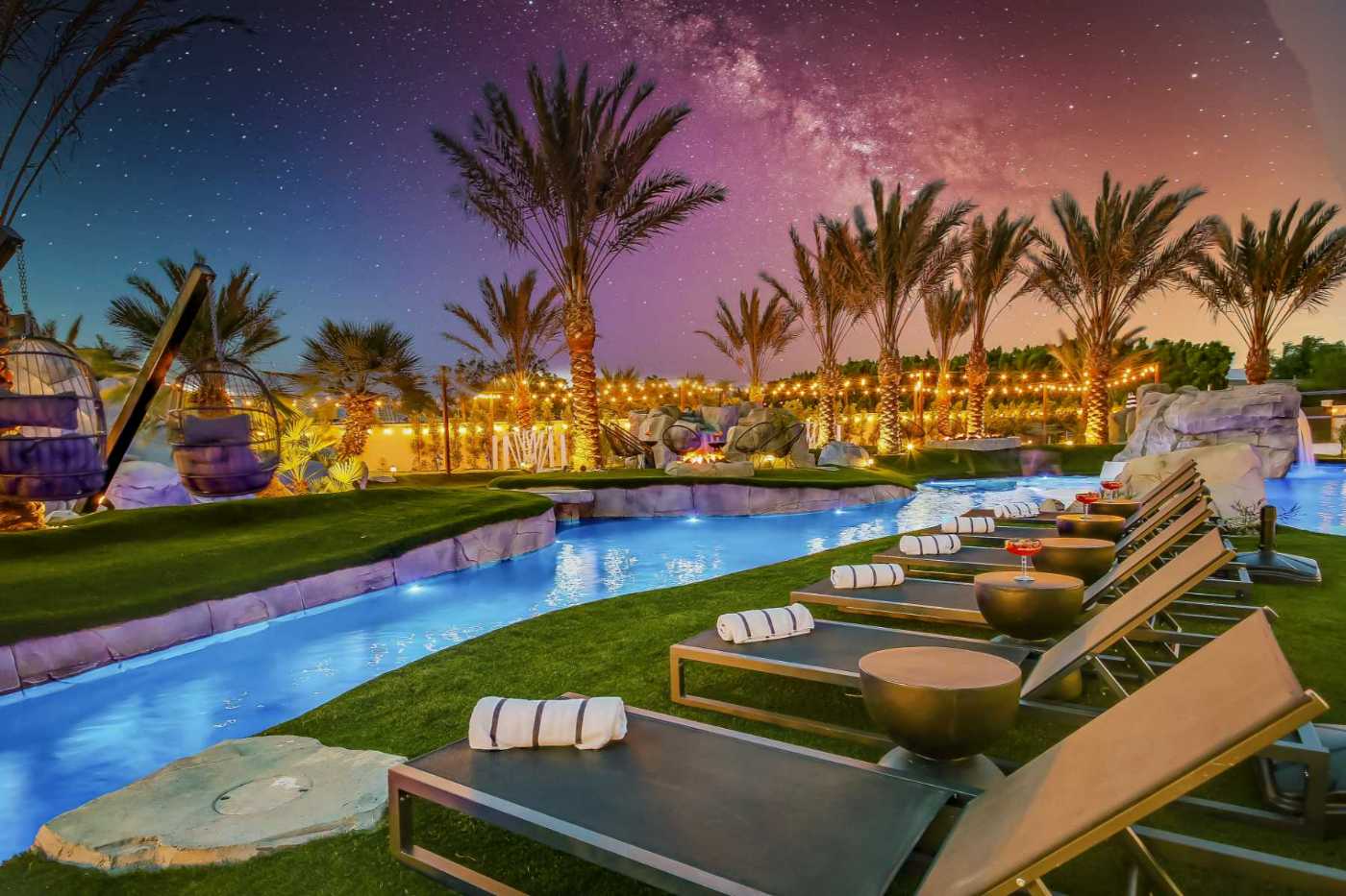 Why settle for a standard pool when you can float your way through the workday? Welcome to Lazy River Resort, a 6,000-square-foot Indio vacation rental where the largest lazy river in Greater Palm Springs winds through a sun-drenched landscape of palm trees, waterfalls and secluded grottoes.