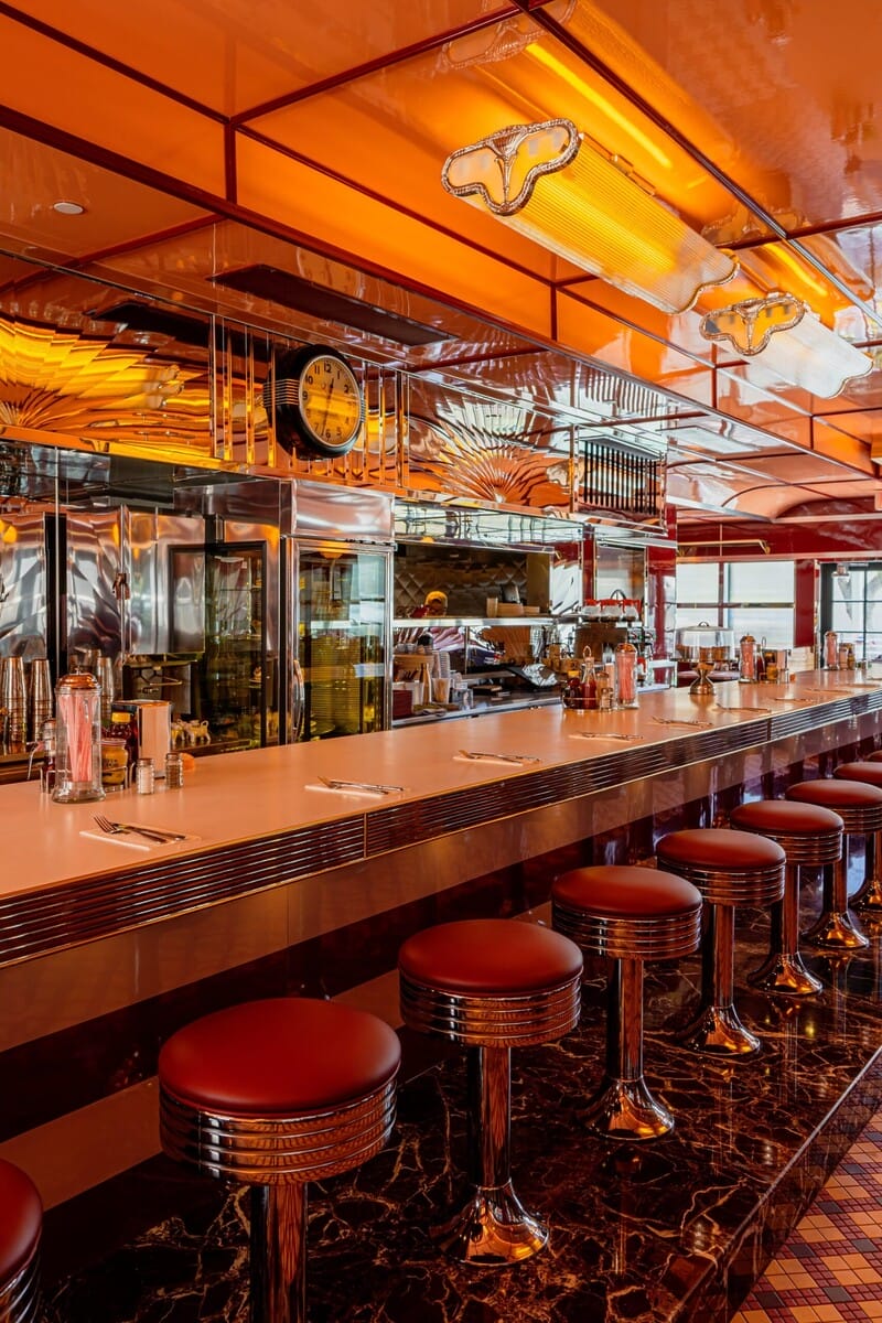 You didn’t have to be around in the 50s to feel the nostalgia when you saunter into this place. Everywhere you turn, you’ll find neon lights, bold colors, classic cars and old movies playing. The walls are decked out with vintage posters (hello, Elvis), and the floors have old school black-and-white checkered tiles. The servers dress the part (think pantyhose and diner dresses), delivering classic diner staples like burgers, milkshakes and fries. Bring your coins for the juke boxes and old school arcade games! This place is great for the whole family.