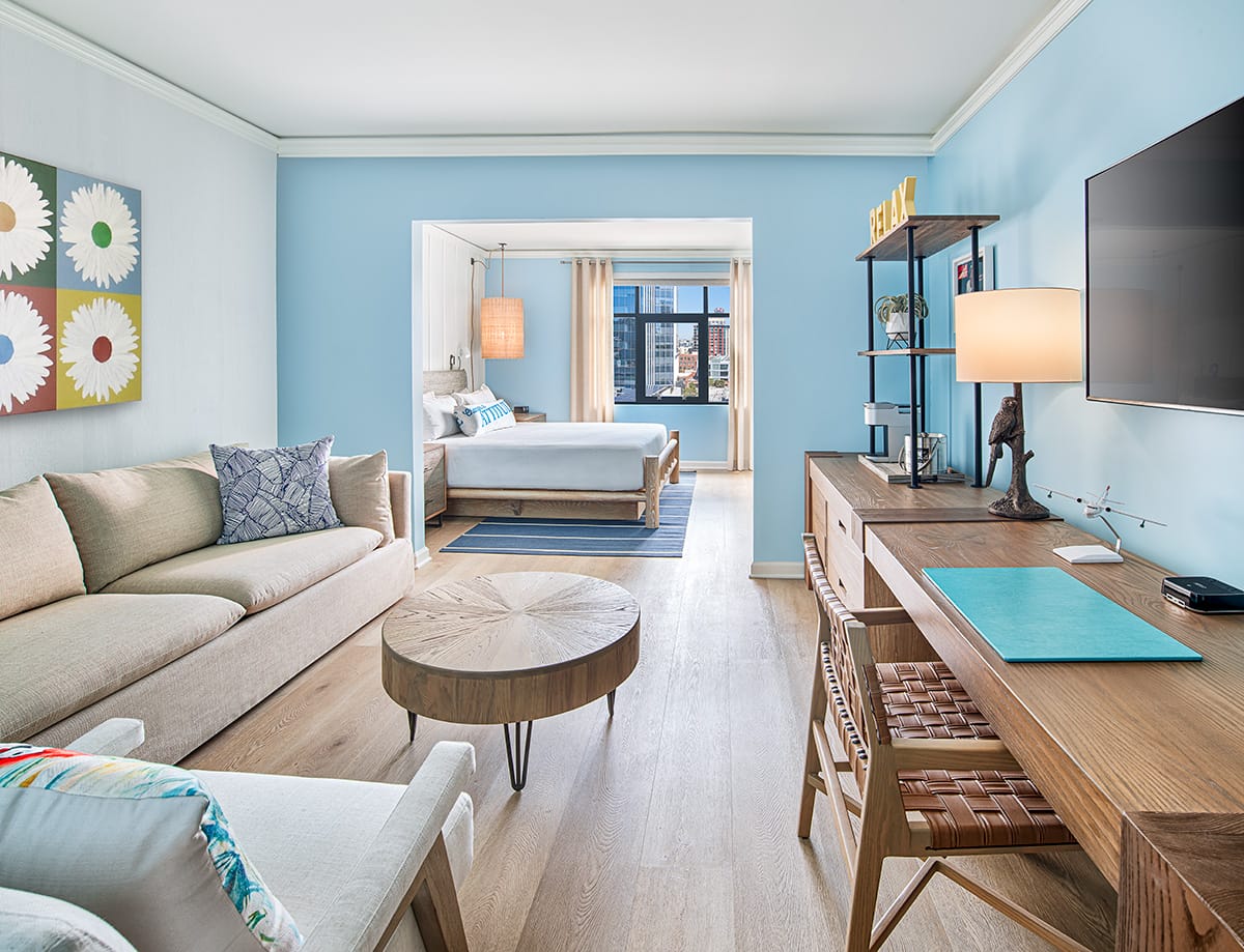 Anchored by beachy accents, including wicker chandeliers and a giant flip-flop, the lobby has a wow factor that also feels fun and welcoming. More Instagrammable moments await poolside, where you’ll find huge parrot murals on the building’s facade, two of which will be named in a social media giveaway at the end of August. Settle in for Baja-inspired bites and endless margaritas on San Diego’s largest rooftop pool deck, which has added four new private cabanas and a central cabana for dawn-to-dusk comfort. Live entertainment will be featured on the 5 o’Clock Somewhere Rooftop Bar show stage.