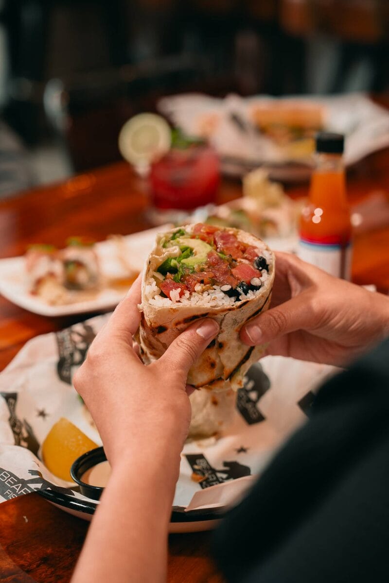 Bear Flag’s burrito menu is an absolute magnet for lovers of both Mexican cuisine and fresh seafood. Each burrito boasts the same simple yet delectable combination of rice, beans, citrusy pico de gallo, fresh avocado and lettuce, encompassing all the elements of a tasty yet stripped-down burrito. And while traditionally served with their grilled, flaky panko-crusted white fish, locals know that the best choice of protein for the burrito is their housemade poke.