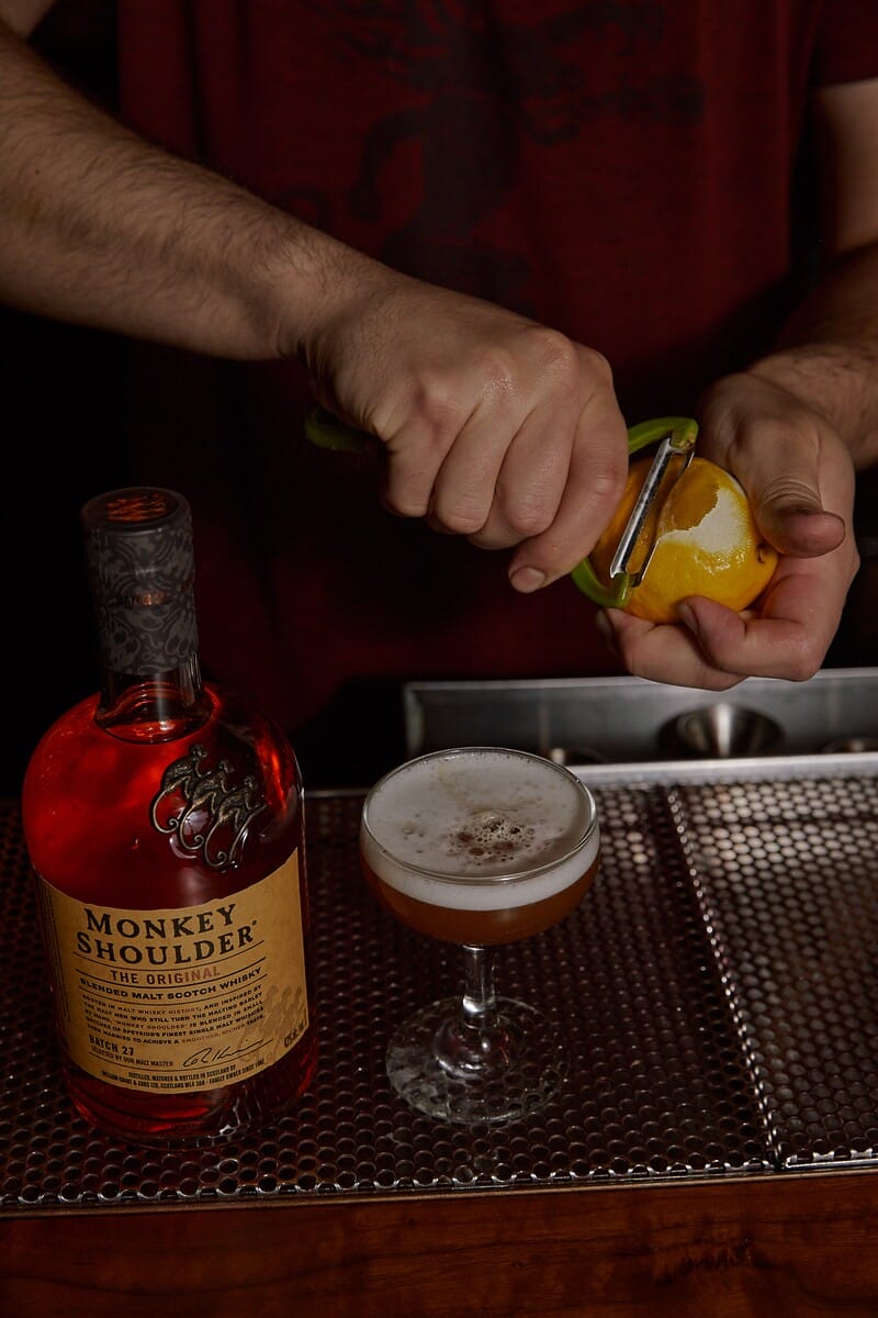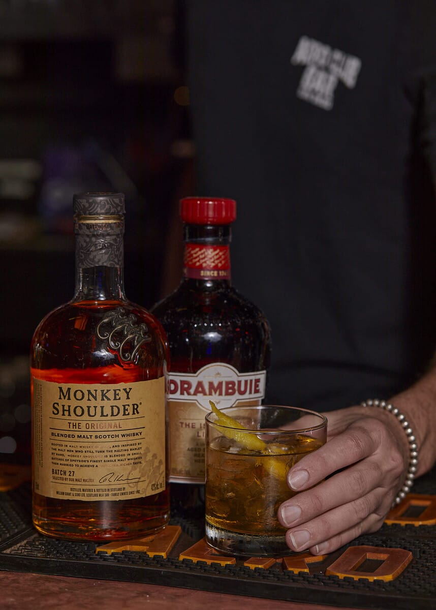 Feeling rusty? Loosen up and double down on the whisky with this blend of smooth Monkey Shoulder Scotch Whisky and Drambuie, a golden Scotch whisky liqueur known for its notes of heather honey, herbs and spices. Pulled together with a simple lemon twist, this spirit-forward concoction has been created for the staunchest of whisky drinkers, and it’s time to prove your loyalty. Sip it slow and keep it by your side for the evening—you won’t be needing much else.