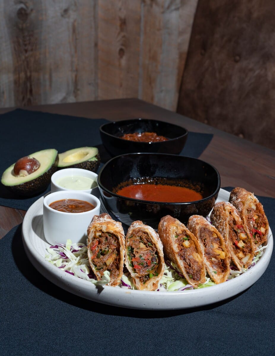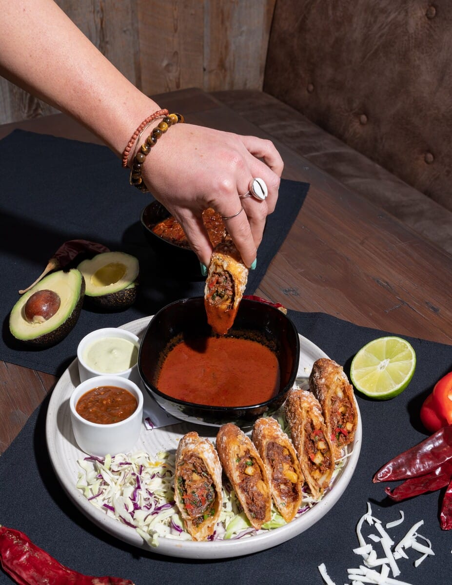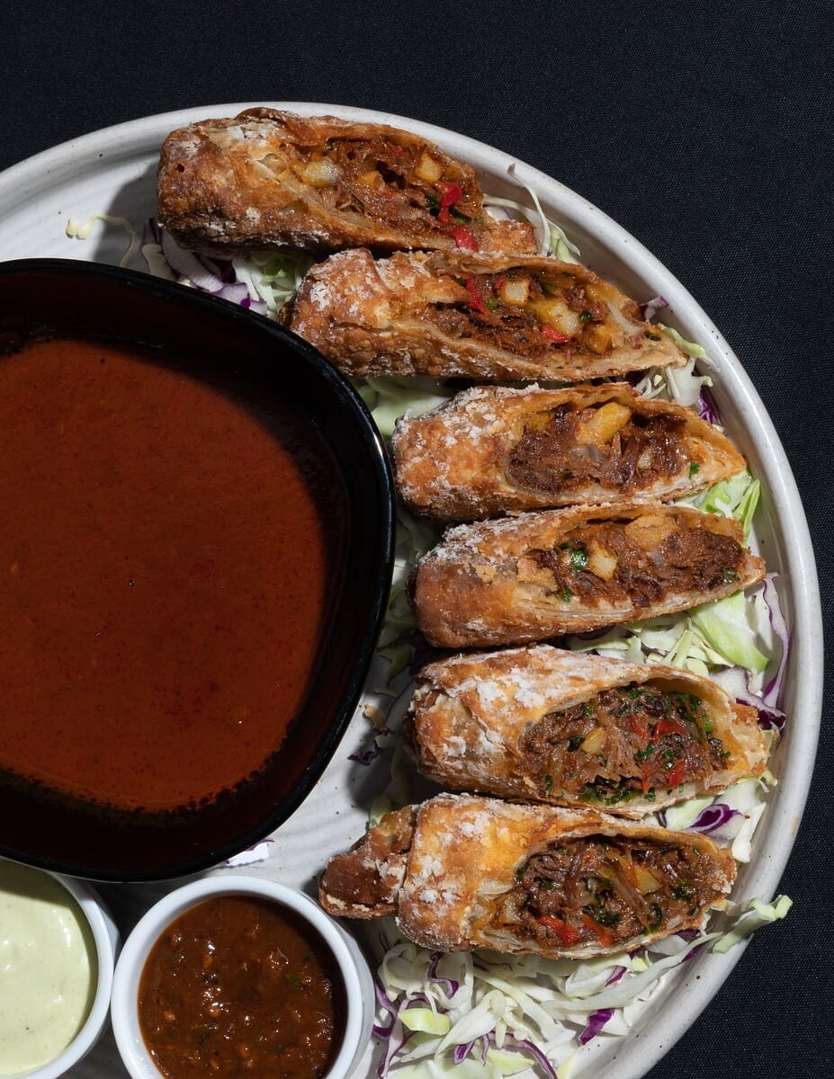 Prior to hitting guests’ plates, the Birria Egg Rolls are a labor of love that start with the filling. Short rib braises slowly with dried guajillo peppers, cinnamon, garlic, and spices. After three hours, it turns into a tender, juicy birria base. The broth becomes a rich consomme dipping sauce for the egg rolls, while the meat gets shredded and fried with peppers, onions, and potatoes. Grated queso Oaxaca and a special housemade chili spice mix in to complete the bold, flavor-packed filling before everything gets tightly rolled in an egg roll wrapper. The last step is to deep fry until golden and crispy.