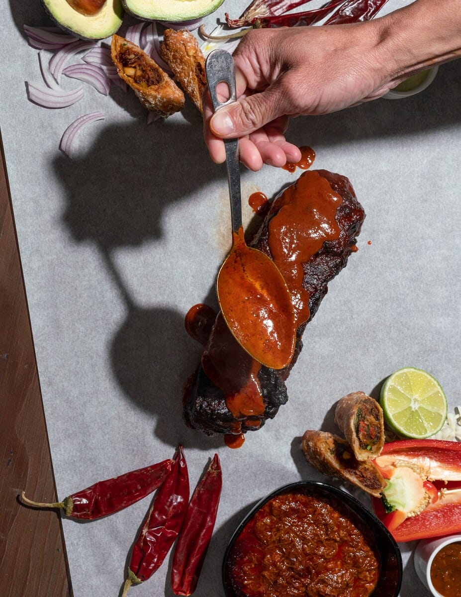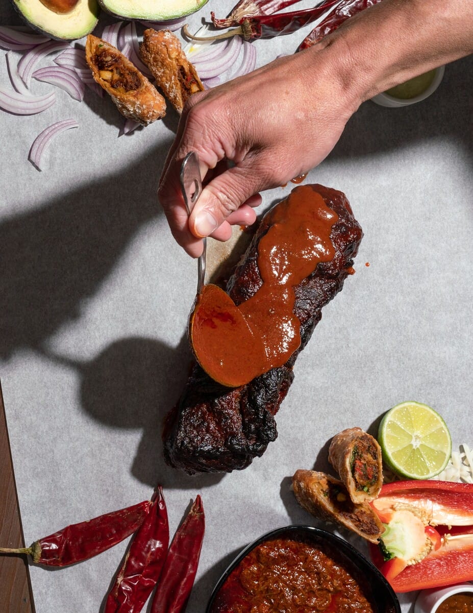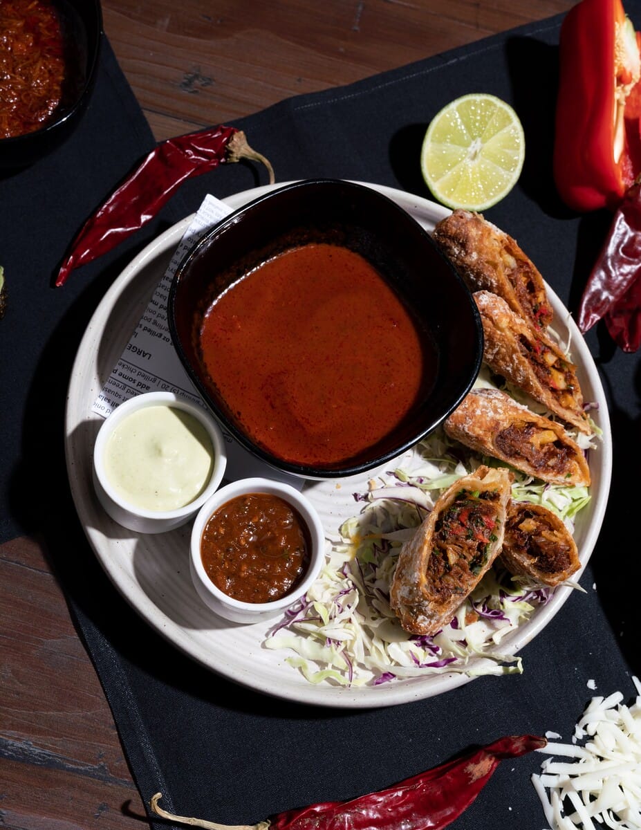 Prior to hitting guests’ plates, the Birria Egg Rolls are a labor of love that start with the filling. Short rib braises slowly with dried guajillo peppers, cinnamon, garlic, and spices. After three hours, it turns into a tender, juicy birria base. The broth becomes a rich consomme dipping sauce for the egg rolls, while the meat gets shredded and fried with peppers, onions, and potatoes. Grated queso Oaxaca and a special housemade chili spice mix in to complete the bold, flavor-packed filling before everything gets tightly rolled in an egg roll wrapper. The last step is to deep fry until golden and crispy.