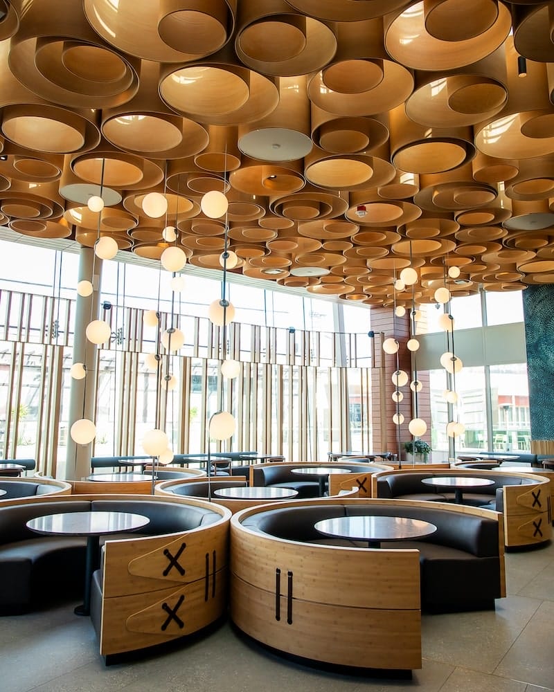 The Din Tai Fung Santa Monica location is one crafted with intention, elegance and a healthy dose of zen. Think beachy hues that mirror the Pacific coastline, natural light and design details that nod to the brand’s rich history. The outdoor patio is a love letter to balance and harmony, with floating circular canopies inspired by yin and yang. Inside, ceiling treatments and custom furniture subtly honor Din Tai Fung’s signature steamer baskets. If this brand knows anything, it’s that the little details make all the difference.