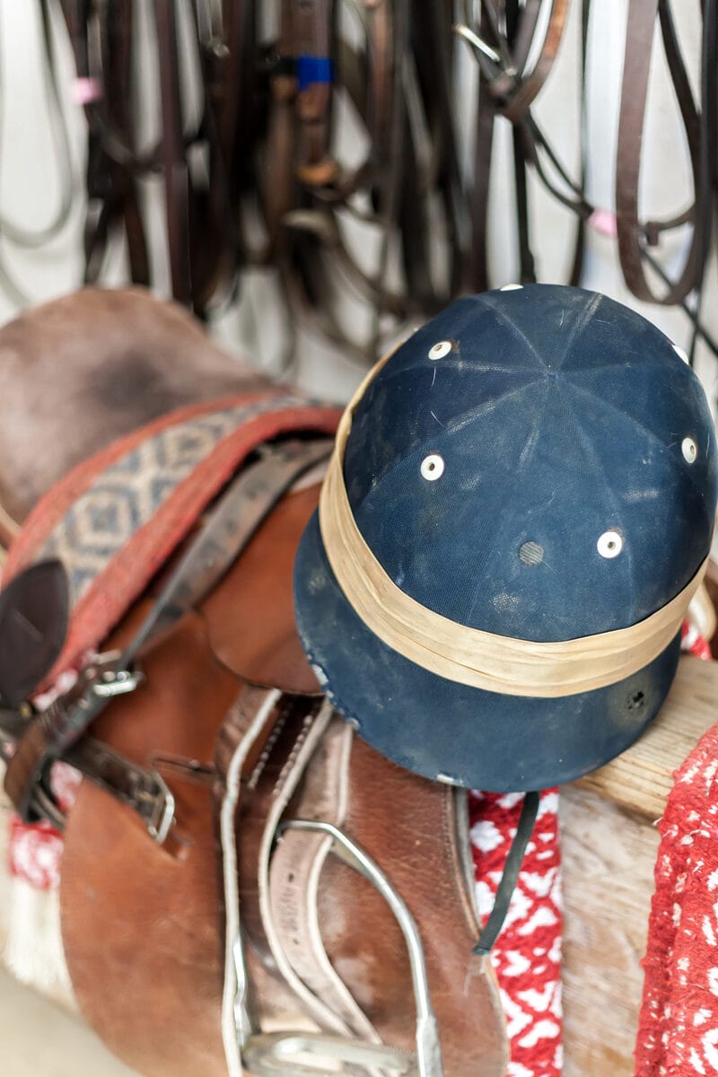 – The uniform includes an equestrian helmet, riding boots and white trousers.