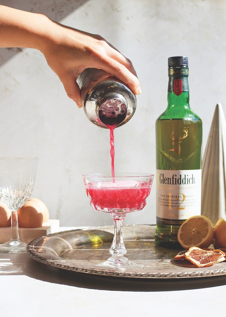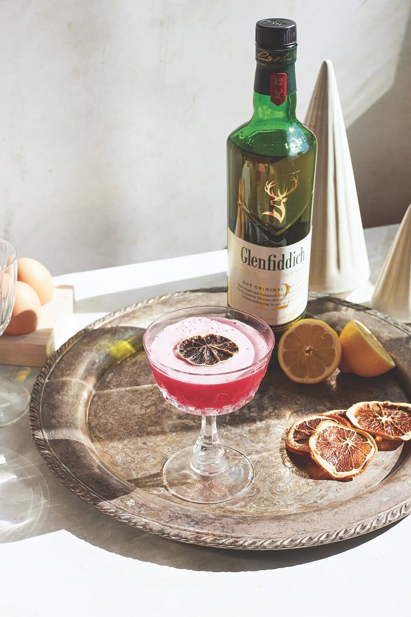 Recipe: In a cocktail shaker, add Glenfiddich Whisky, cranberry syrup, lemon juice and egg white. Shake without ice for about 20 seconds. Add ice and shake again. Double strain into a coupe or rocks glass, and garnish with a dehydrated citrus wheel.
