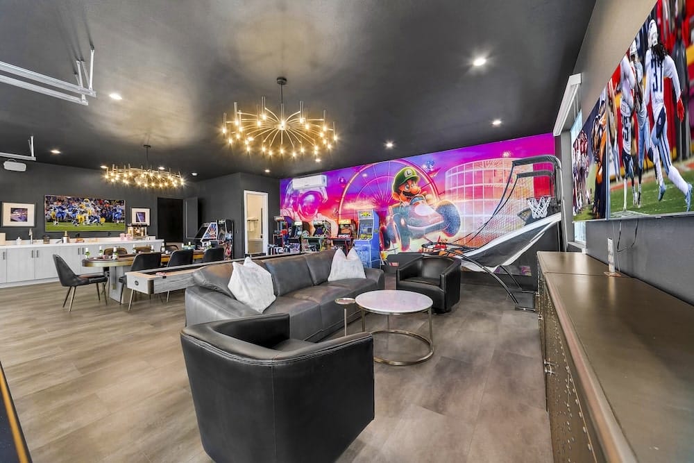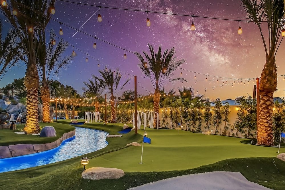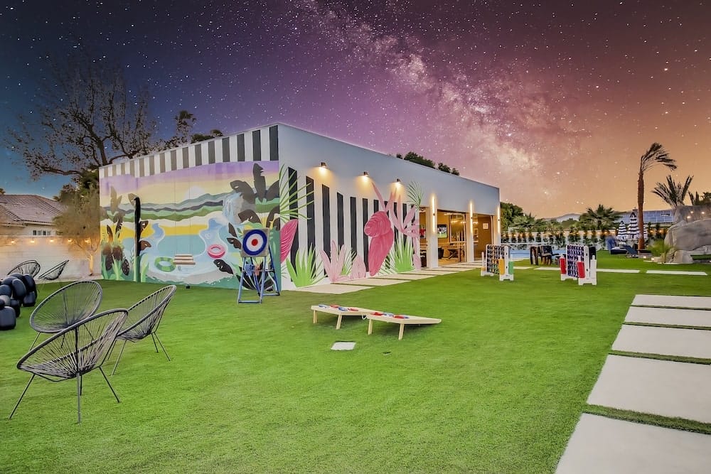 More than just an Indio vacation rental, Lazy River Resort is the ultimate desert escape. This luxurious 6,000-square-foot private property features the largest lazy river in the desert, winding around palm trees and sun-drenched loungers. Guests can relax in the 20-person spa, cool off in the grotto or engage in endless activities, from pickleball and bocce ball to arcade games and mini golf. The resort’s spacious outdoor dining areas, complete with fire pits and a built-in BBQ, make it ideal for large gatherings and special occasions. Whether you’re floating the day away or taking in the stunning desert sunsets, Lazy River Resort offers an unforgettable stay in the heart of Indio.