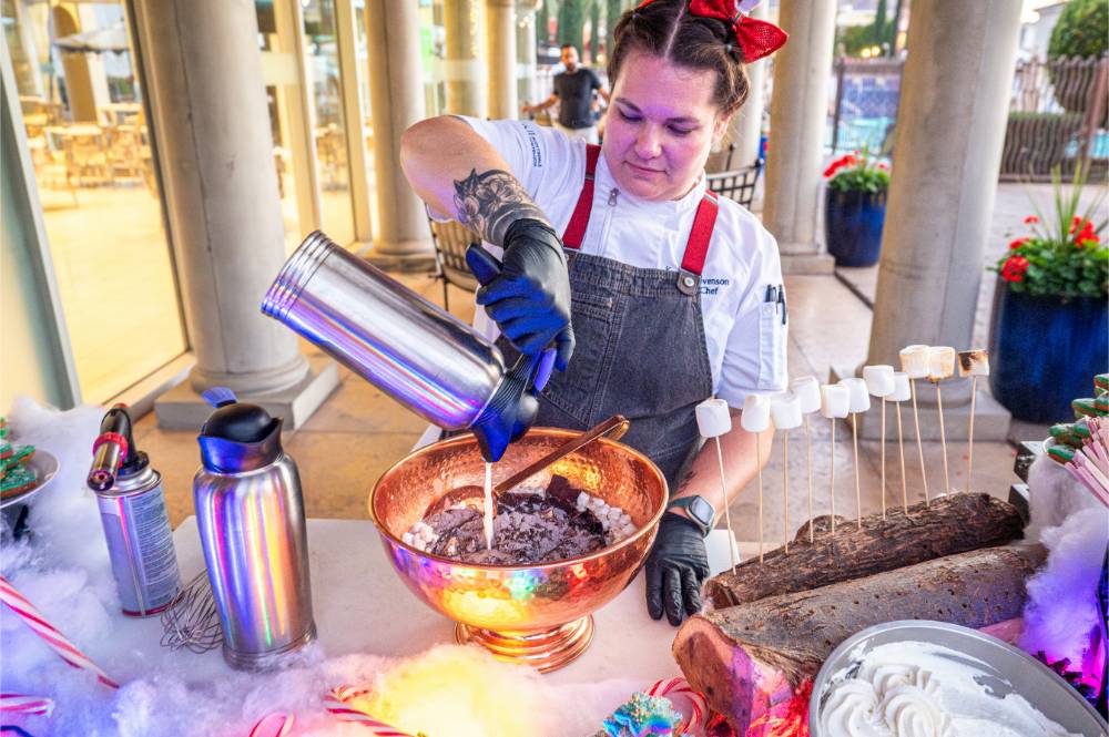 Dinner awaits at Prado Restaurant, where Mediterranean flavors unfold with calamari and beef tenderloin, festive sangria pairings and a menu alive with holiday energy. On Dec. 24 and Dec. 25 the resort offers special four-course prix-fixe dining with live music to mark Christmas Eve and Christmas Day. After dinner, drift to Blitzen’s, the pop-up bar at the Oasis Pool, where fire pits flicker and Camelback Mountain glows in the distance. Ask the bartender for their signature winter cocktail: a spiced, sparkling sip that says, “This is Scottsdale, and we’re celebrating.”