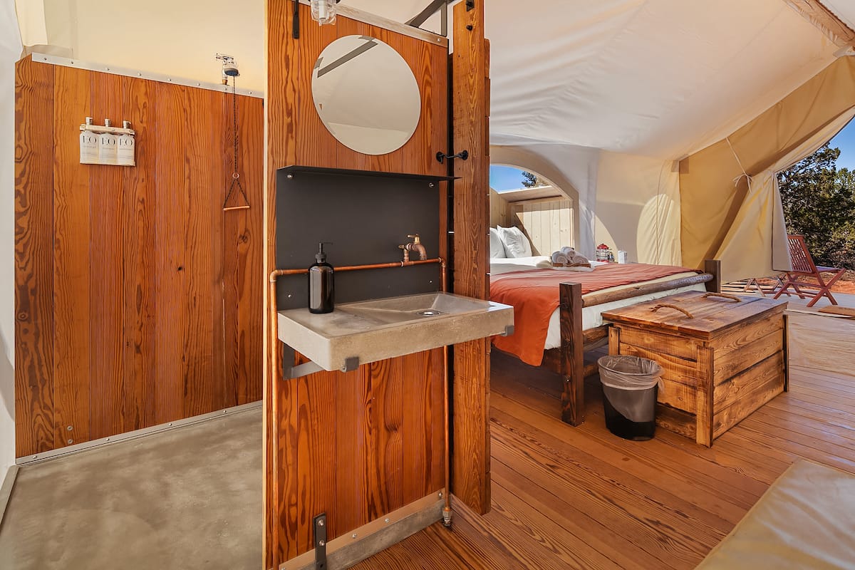 From Southern California, the most accessible sites are the Grand Canyon, Zion, Moab and Lake Powell. “We are looking to offer people a grand tour of the southwest desert to explore the whole desert region… taking a three- to seven-day trip,” explains Gaghen. Take a road trip, stay a night or two at each of these camps and explore the beauty around each. Gaghen’s personal favorite campsite is Zion. “It’s located in this beautiful setting with amazing views into Zion National Park, and it’s [these] huge mountains and canyons—the colors of the desert are remarkable.” Under Canvas provides activity recommendations for each park (think horseback riding, hiking and river rafting), and even on-site complimentary camp activities like cornhole.