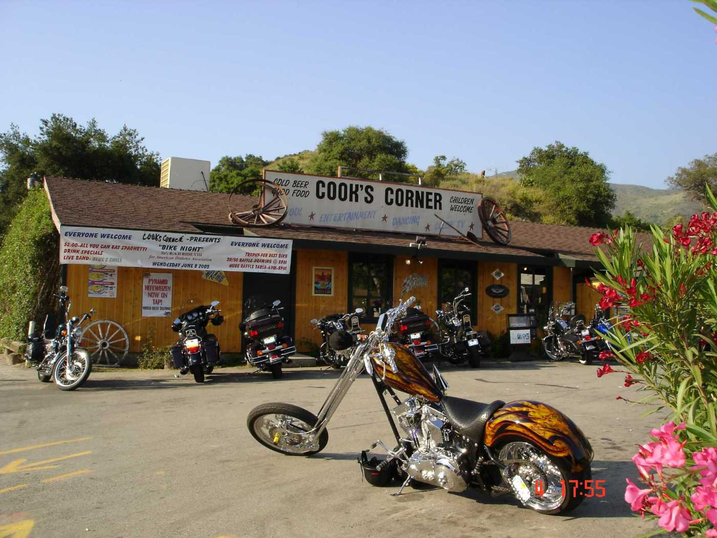 Cookās Corner is one of Southern Californiaās most iconic hangouts for motorcyclists, locals, and visitors looking for good food, cold drinks and a lively atmosphere since 1884. More than just a bar, Cookās Corner is a community hub offering live music, special events and unbeatable Happy hour specials. Weekly highlights include Open Mic Mondays, Taco Tuesday with $3 tacos and margarita specials, Spaghetti Night Wednesdays and Thirsty Thursdays. Having survived earthquakes, fires, floods and more, Cookās Corner remains a resilient symbol of Southern Californiaās biker culture.