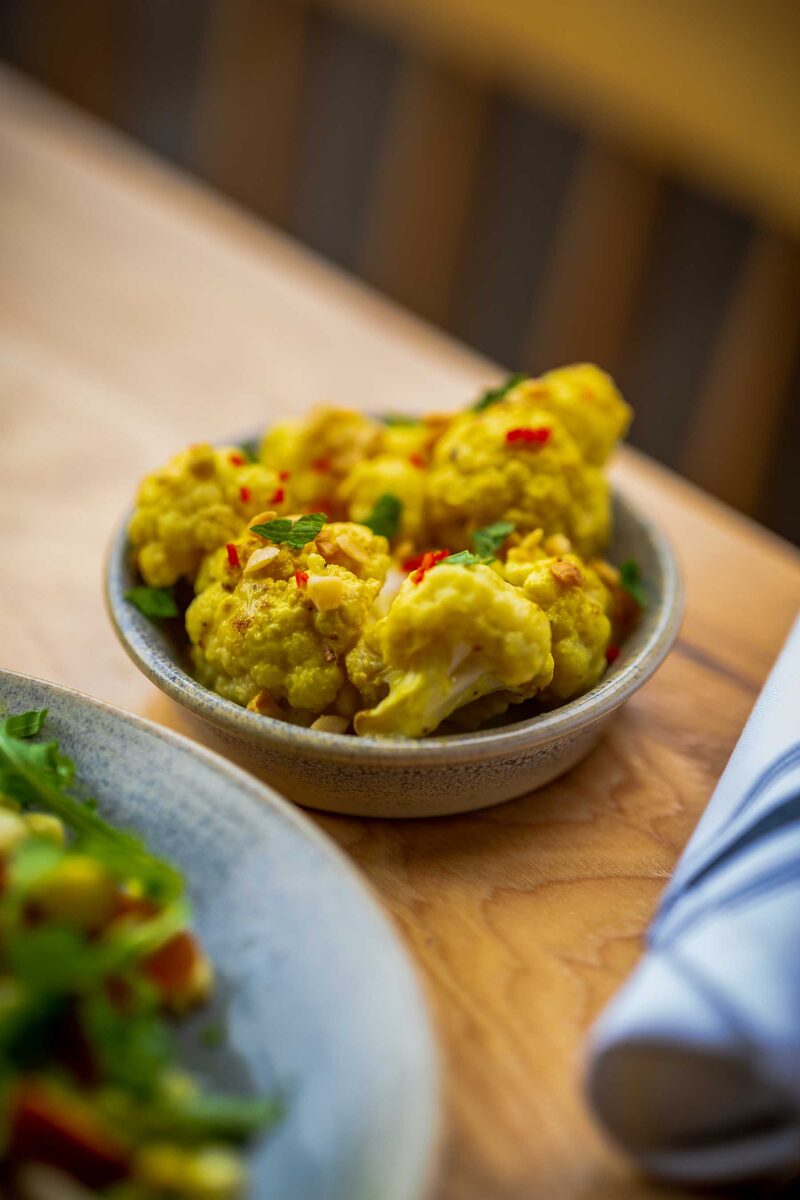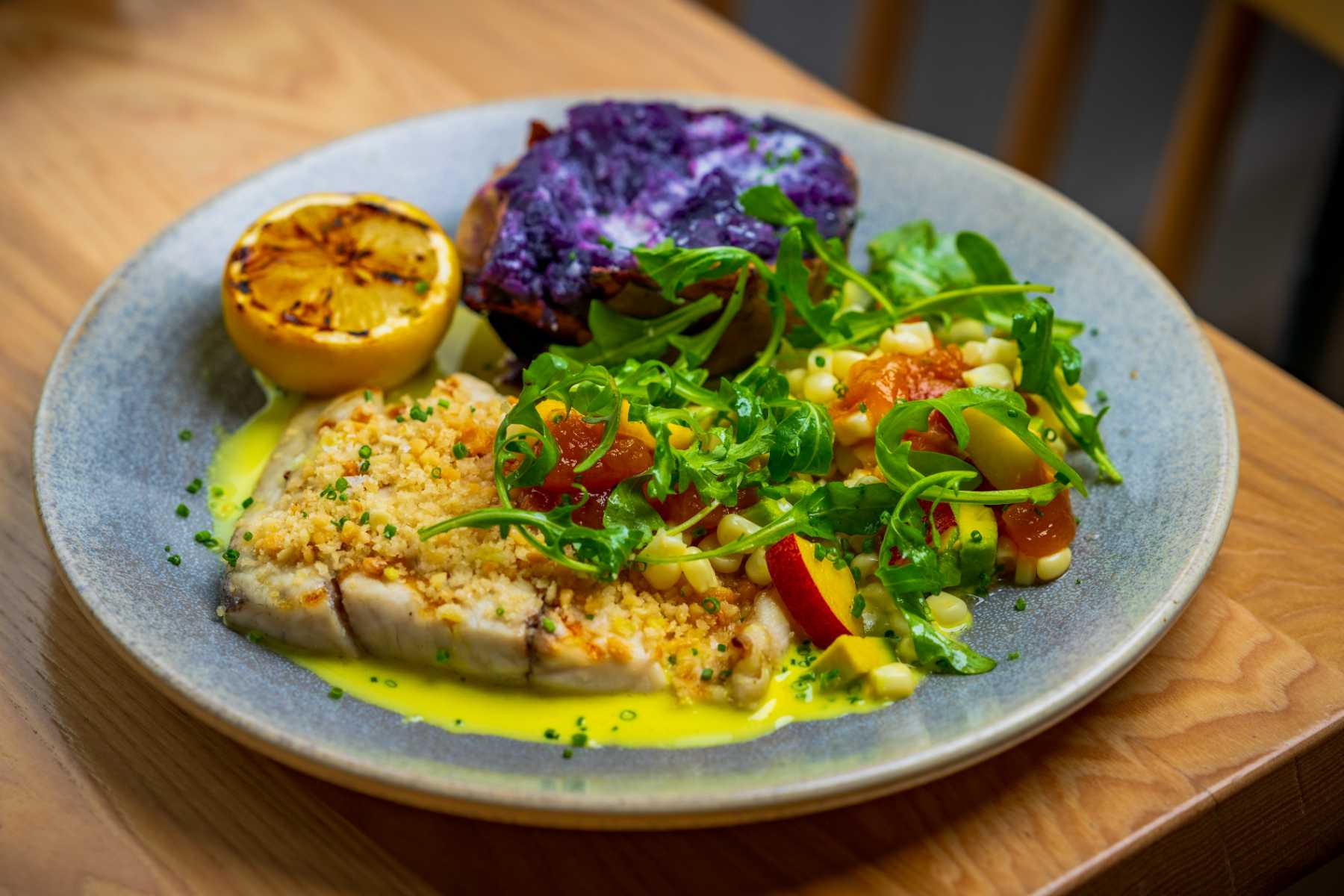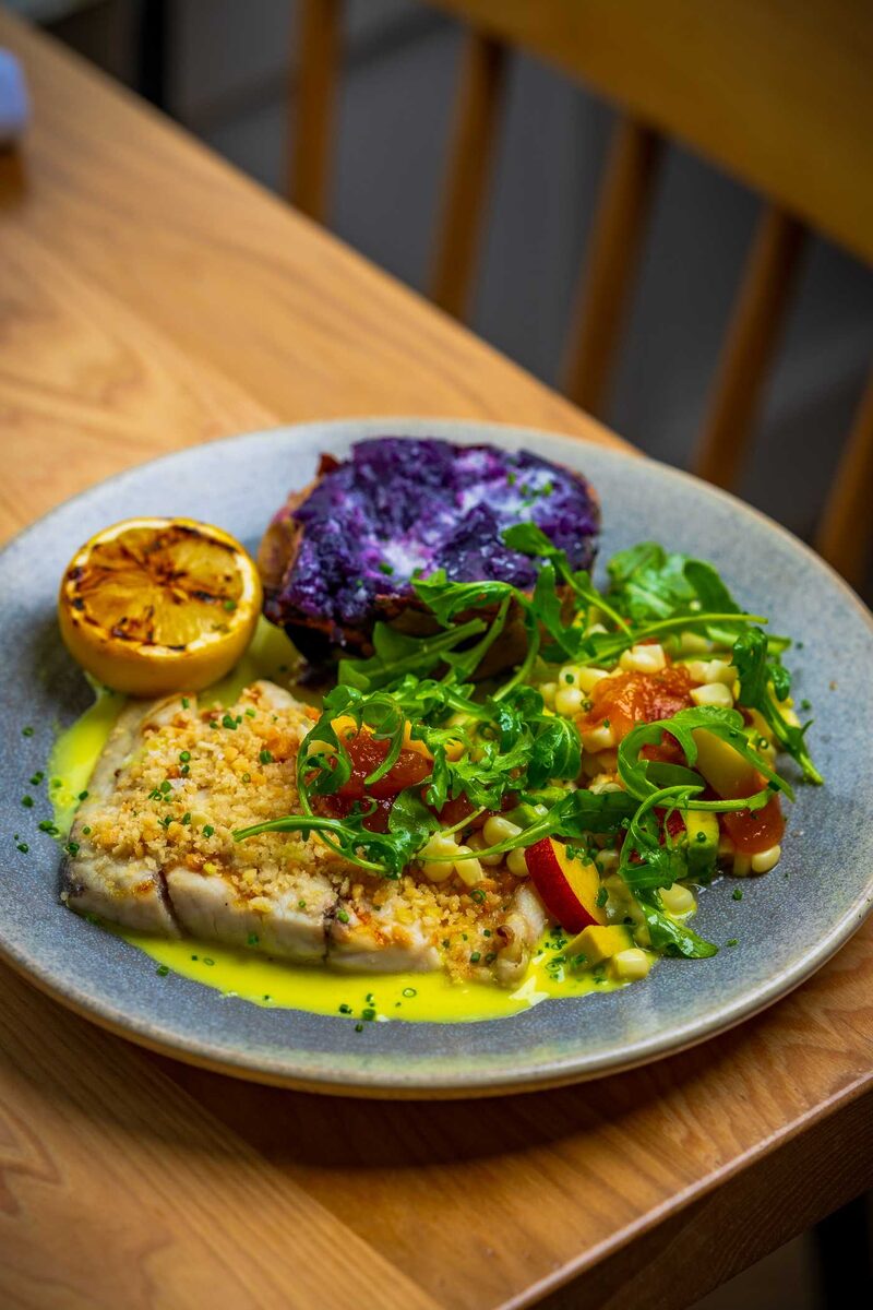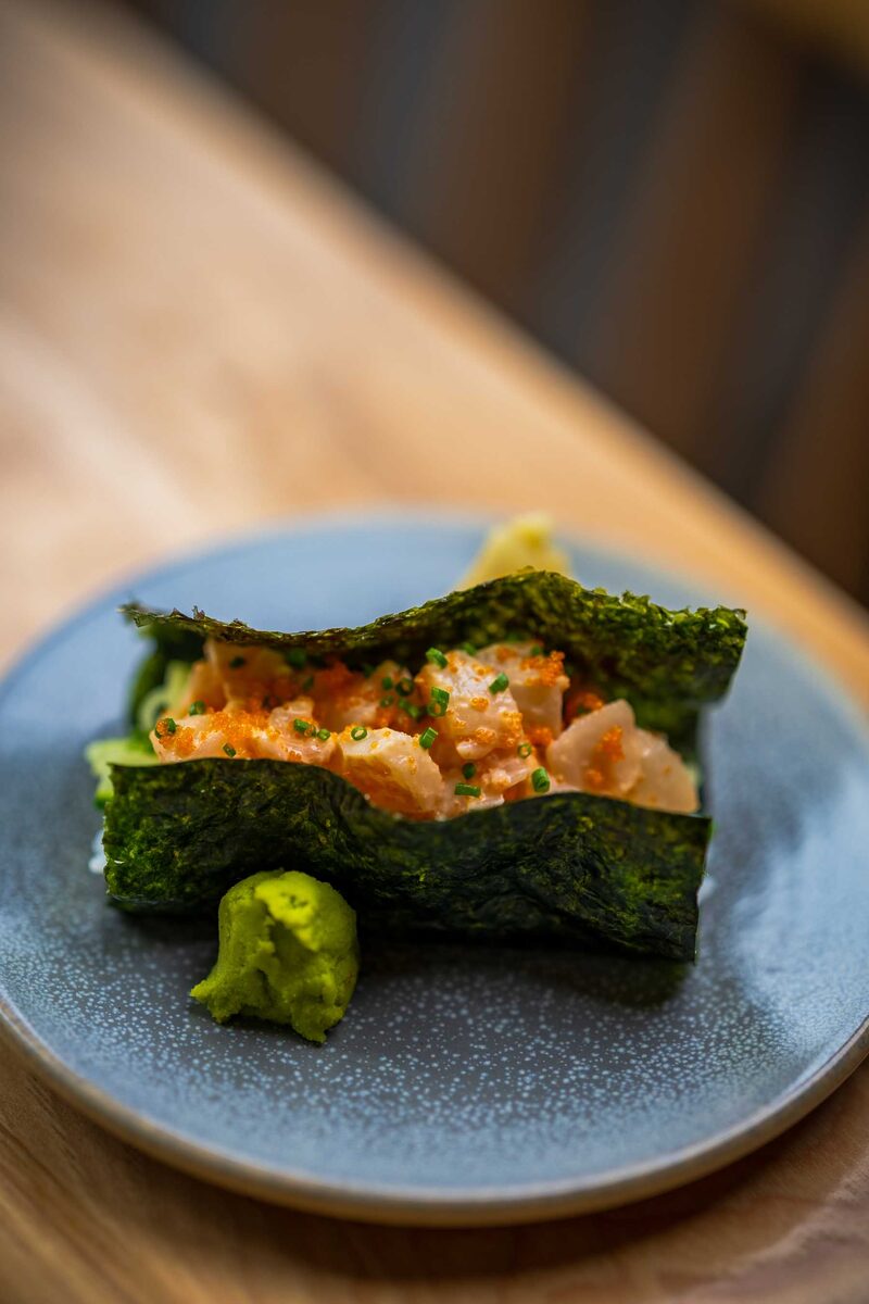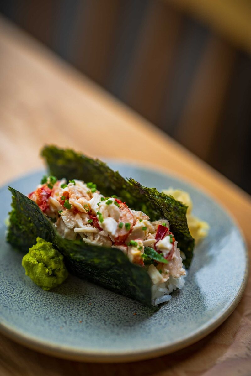 The Lobster Hand Roll is a cool combo of creamy lobster salad, cucumber, and avocado, while the Spicy Scallop Hand Roll brings the heat with sriracha aioli. The star of the show? That Summer Sea Bass. It’s crusted in macadamia nuts, layered with a turmeric coconut sauce, and served with a corn and arugula salad, peach chutney, and a baked Okinawan sweet potato. It’s luxe but approachable, just like the brand itself.