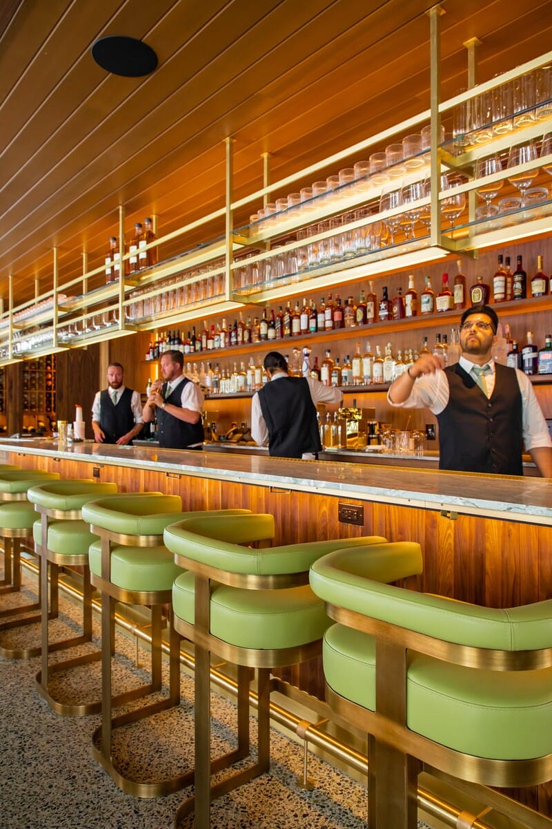 As you enter through the green front doors flanked by breeze blocks, a vibrant interior is unveiled with brass details, warm millwork and an exquisite terrazzo-tiled floor. Complete with heaters and misters, the patio of Palm Desert’s all-new Porta Via is shaded by a stunning pergola and offers diners a front-row view of the surrounding mountains. Porta Via Palm Desert