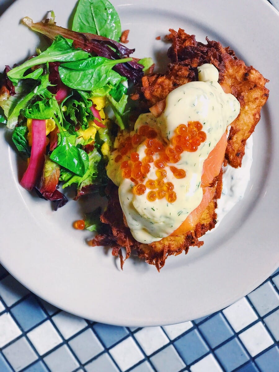 Now that you’re all checked in and ready to start your day, we recommend making a quick stop downtown at the iconic Perly’s, a Jewish restaurant and deli known for its creative spins on traditional dishes. For those on the go, we recommend the bagel with fish, the Reuben or the Chazerai hot dog. If you’re looking for a full spread, you can’t go wrong with The Schnorrer: two eggs any style, your choice of breakfast meat, potato latke with applesauce and chive sour cream and your choice of toast.
