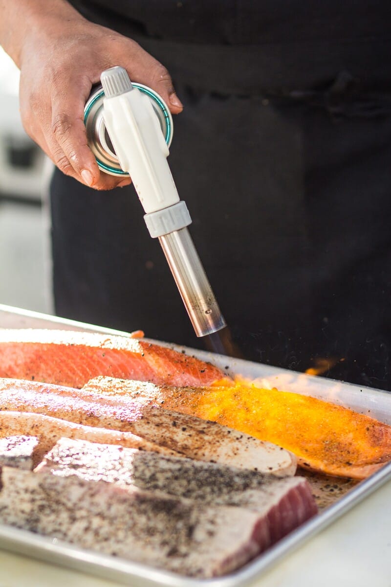 KT: I like to use Loch Etive steelhead trout (also known as ocean trout) from Scotland because of the quality, great taste and high amount of omega-3 oils. It’s sashimi grade fish that can be used for sushi, sashimi, cooked dishes, crudo, carpaccio and tartare. We have served this fish at over 500 events and it’s a popular fish with our customers and friends. It’s always accessible to the public and it’s similar to king salmon.
