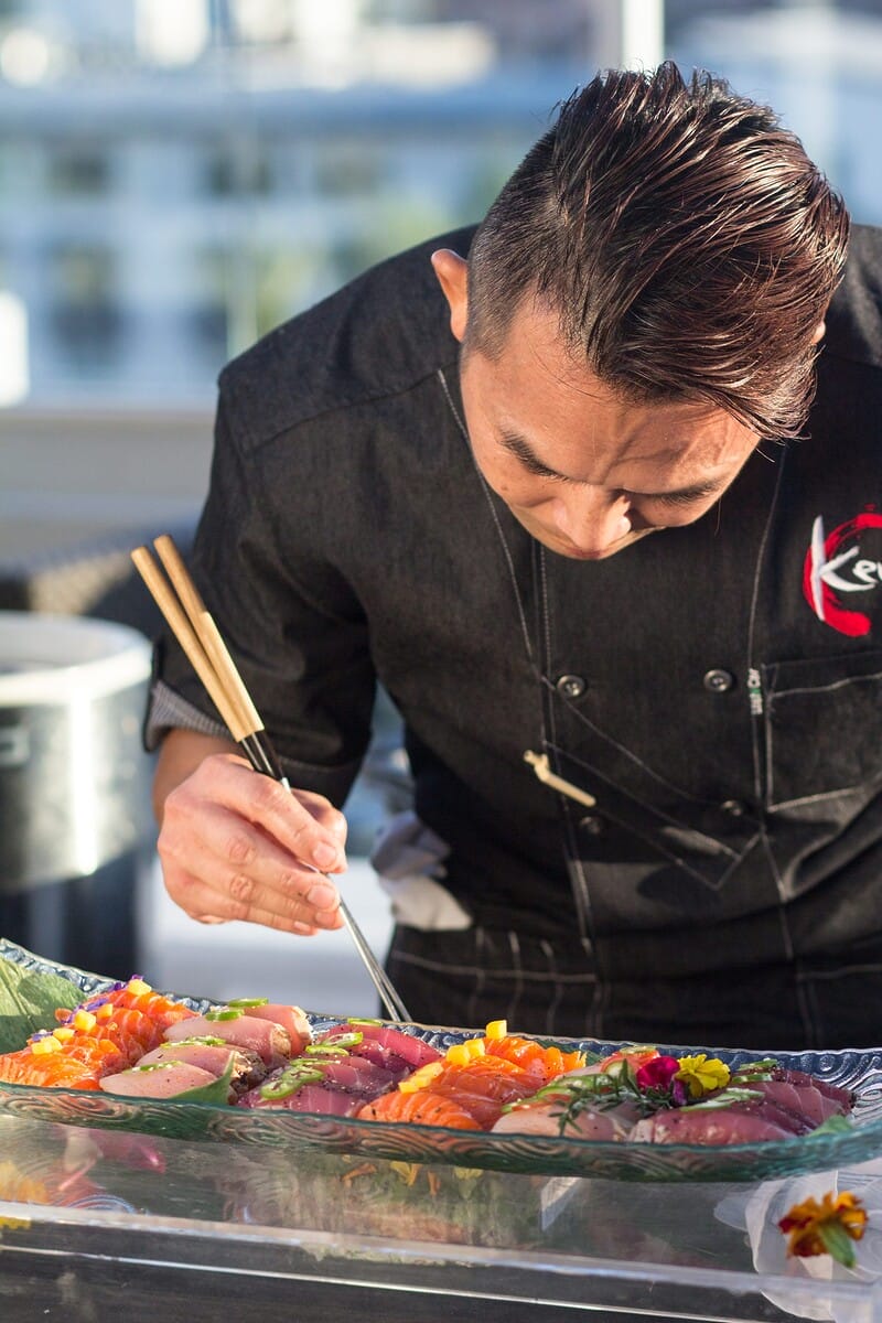Chef Kenji Jampathong took an unorthodox route to becoming an acclaimed sushi chef. He first pursued computer science as his field of study. On the side, he worked at various restaurants cultivating the passion that would soon define his career. When he finally traded in circuit boards and microchips for cutting boards and knives, he was still developing his craft. But after years of working under various sushi masters, Chef Kenji has become a sushi master in his own right. Today, he is sought out for a wide variety of events ranging from high profile celebrity dinners in Hollywood to small parties in family homes to large corporate events. What elevates Chef Kenji above his contemporaries is the way he takes traditional sushi elements and uses them to create plates and combinations of flavors you won’t see in your neighborhood sushi restaurant. A menu can include anything from seared ocean trout to venison sushi to Wagyu beef carpaccio. Chef Kenji’s sushi is reimagined and redefined; it’s art in its own right.