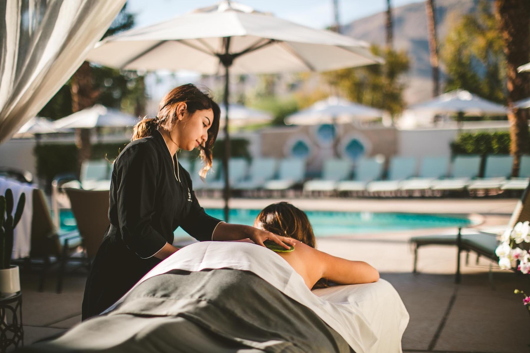 When it comes to panoramic views and polished luxury, The Ritz-Carlton Spa doesn’t play. Built into a cliffside, this serene sanctuary overlooks the entire Coachella Valley and offers a treatment menu rooted in desert botanicals and modern wellness science. Their Spirit of the Mountains massage uses grounding stones and native herbs to calm and center. It also offers couples massages or wraps and an age-defying facial that smooths out fine lines. This is your “treat yourself like a celebrity” moment, so go ahead and book the enhancement.