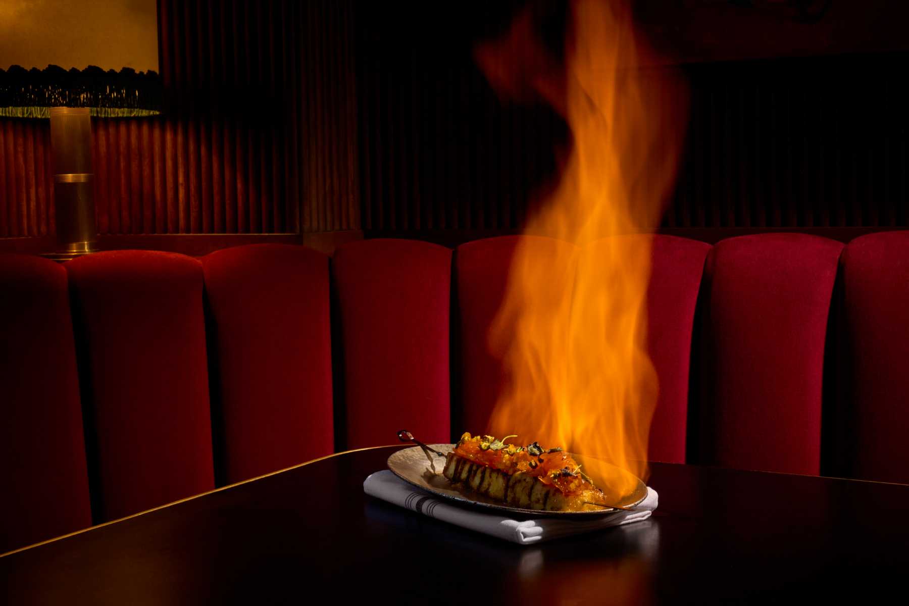 Evening plans begin upstairs at Checker Hall, a vibey restaurant and bar tucked into a restored Masonic lodge. The space is warm and cinematic—arched windows, plush booths, moody lighting—and the menu is a Mediterranean-meets-California spread of small plates. But the must-order dish? The flaming cheese dish. A sizzling skillet of halloumi with herbs, lemon, honey and olives that’s lit on fire tableside. Pair it with their signature cocktail, The Screaming Parrot—an herbal, tropical, citrusy concoction that hits just right. Depending on the night, you might catch a live band or DJ in the attached music venue.