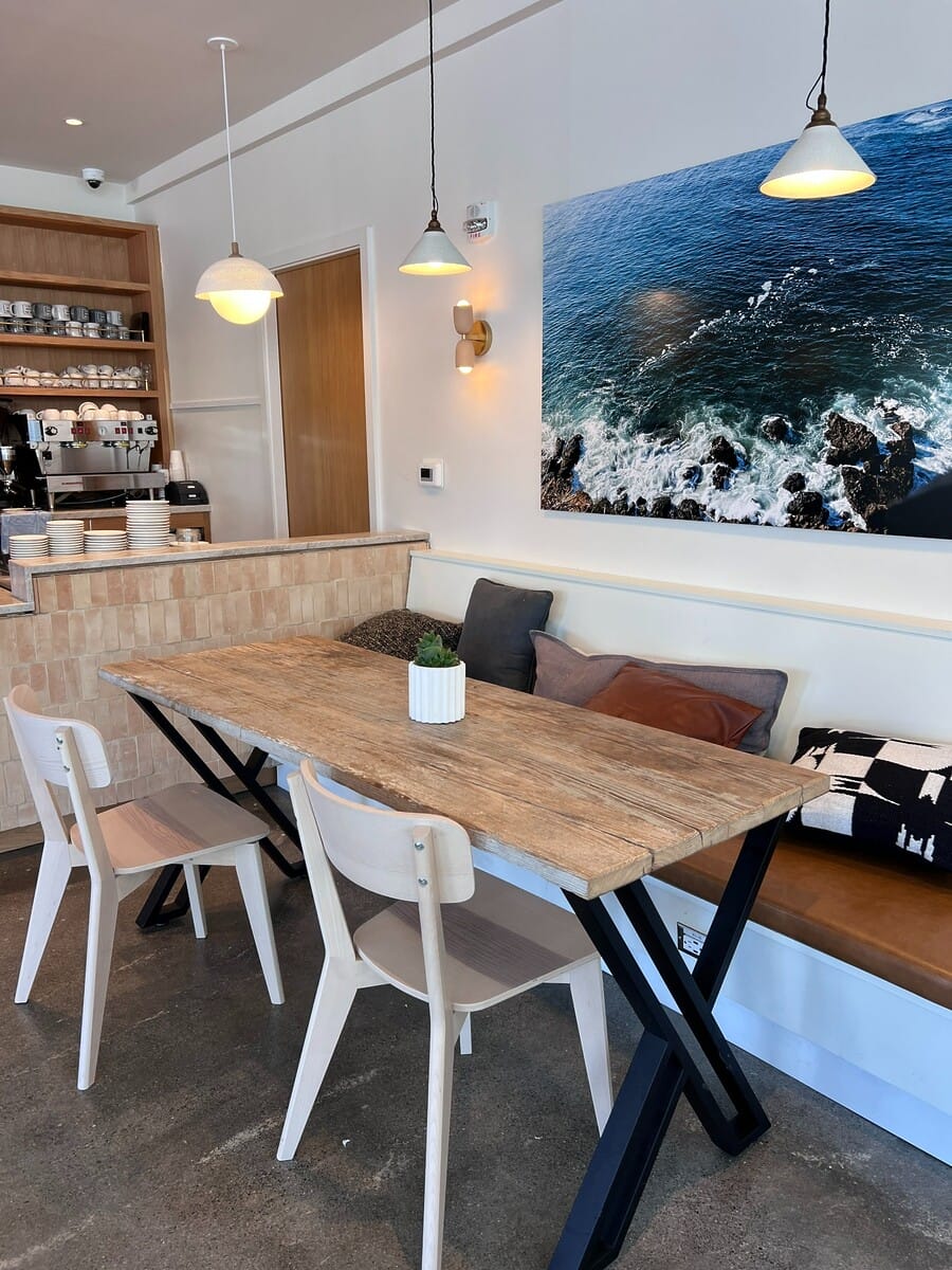 Hand-written signs, window box flowers and un-fussy accents like mismatching pillows and cushy bench seating make for a welcoming waterfront aesthetic. All the while, the San Francisco skyline and ocean views—clear from both indoor and outdoor vantages—steal the show. Another signature stamp of the Malibu Farm family is its rustic retail shop with a decidedly general store vibe, offering souvenirs and merch to tempt tourists and locals alike.